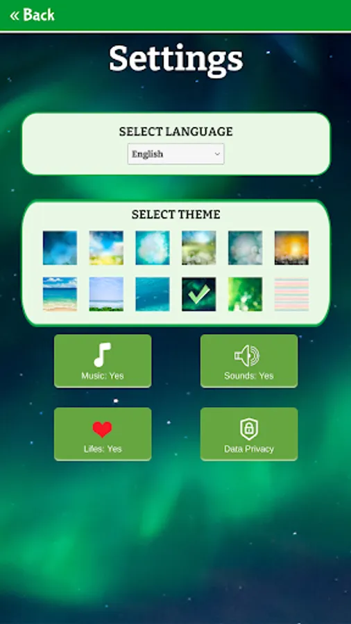 You can customize the appearance of the game with 12 themes such as bokeh backgrounds of different colors, northern lights, wooden, beaches...