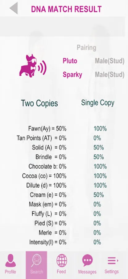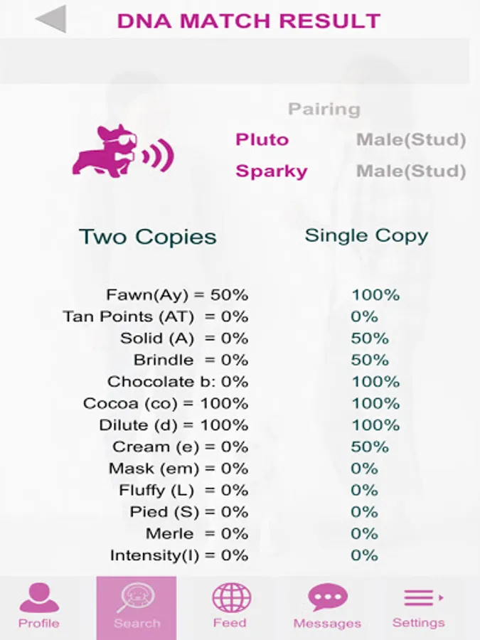 Match your French Bulldogs DNA with other dogs in your breeding program or with other breeders. Determine what the odds are of specific colors or characteristics in an anticipated litter.