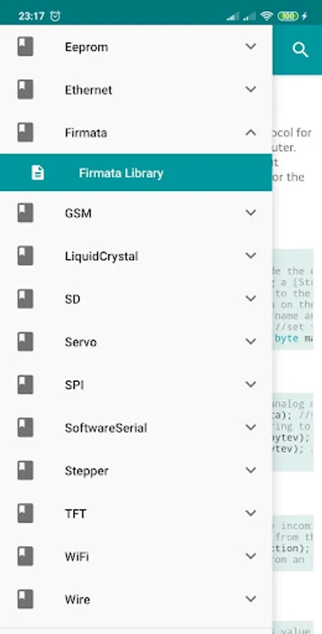 Arduino Library Reference is an Standard Library Reference for Arduino, divided in library arduino: EEPROM, Ethernet, Firmata, GSM, LiquidCrystal, SD, Servo, SPI, SoftwareSerial, Stepper, TFT, WiFi, Wire.