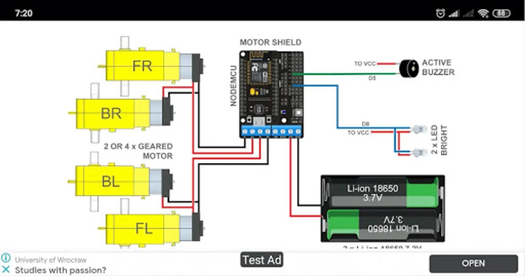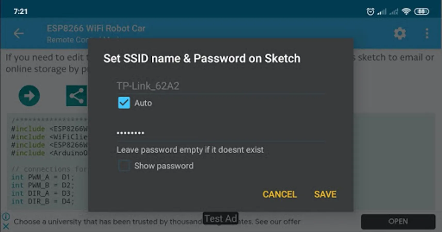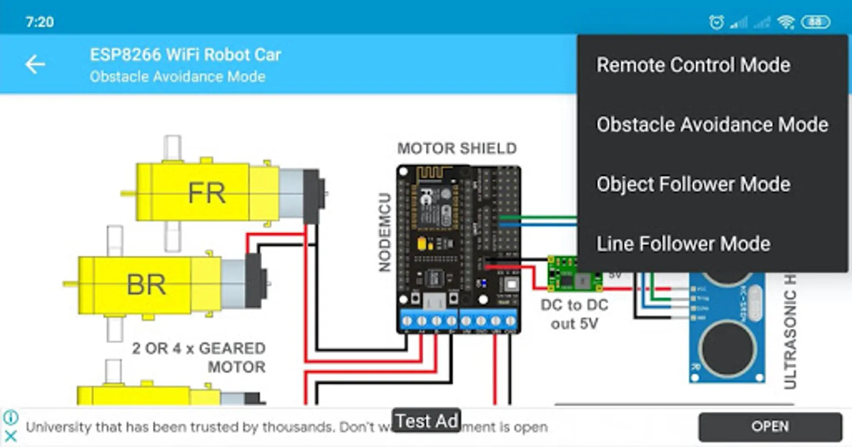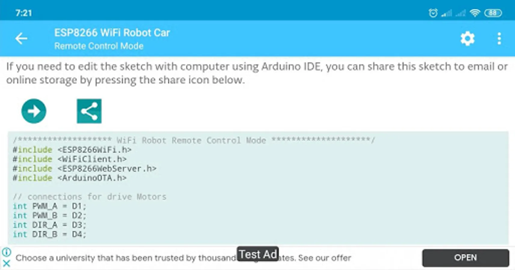 This app is designed to make it easy for you to build a basic Wifi robot car. The app allows you to control an ESP8266 based robot car over Wifi (on AP/STA mode), and also you can upload Arduino sketch/code directly from your Android phone to ESP8266 via USB OTG or Wifi OTA (Over-theAir).nnPlease be advised that this app contains ads and potential in-app purchase to improve next app development.