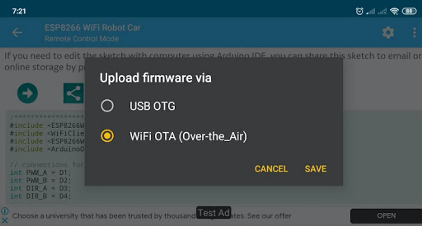 - Upload firmware via USB OTG or WiFi OTA directly from Android phone