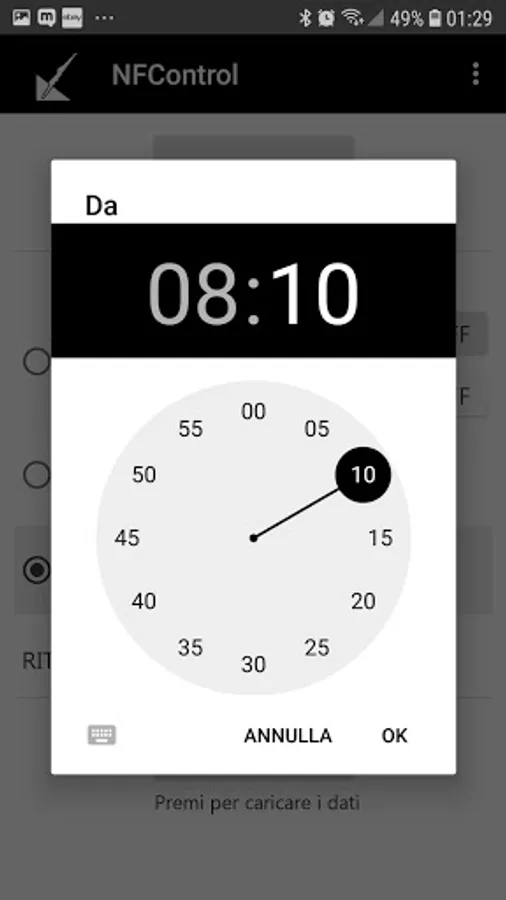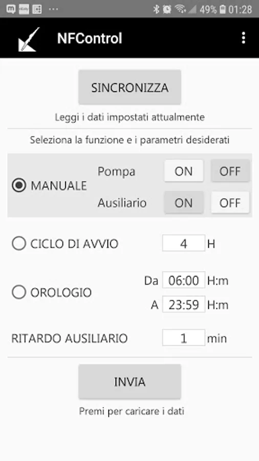 The NFControl app can read and write data on the NFControl Mifare NFC card. The smartphone must be close to the card. The Synchronize button reads the programming data from the NFC card. The Send button sends the data to the NFC card. The app allows you to modify the displayed data before uploading them.