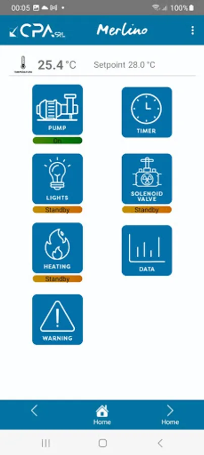 The Merlino Cloud app is able to remotely read and write the parameters of the CPA WiFi iOT devices: chlorine generators, devices for reading and regulating pH and Rx, for managing heaters, hot tubs, pumps, lamps RGB. The app user must be connected to the Internet, must login with username and password, then must select one of the devices in the list of user devices.