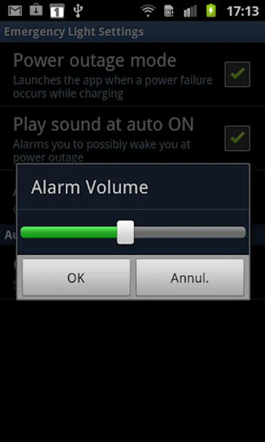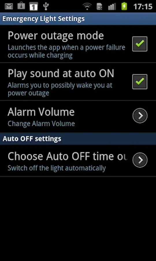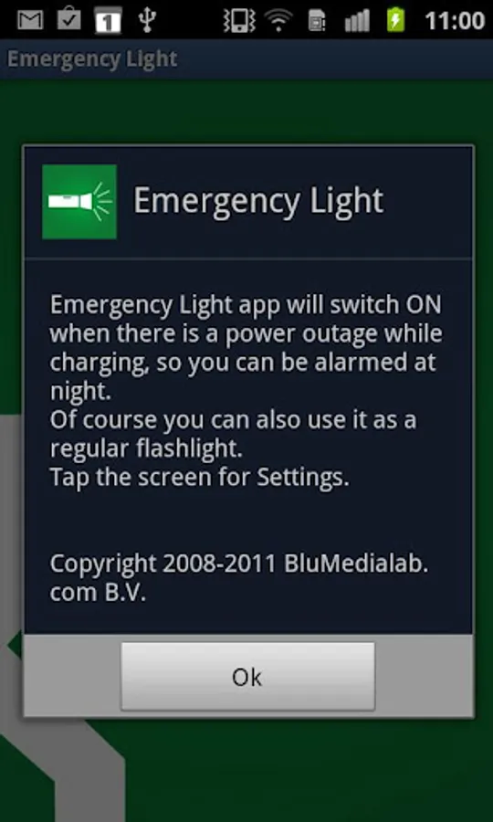 Emergency Light app will switch ON when there is a power outage while charging, so you can be alarmed at night to save the stuff in your fridge or to check out what is happening.