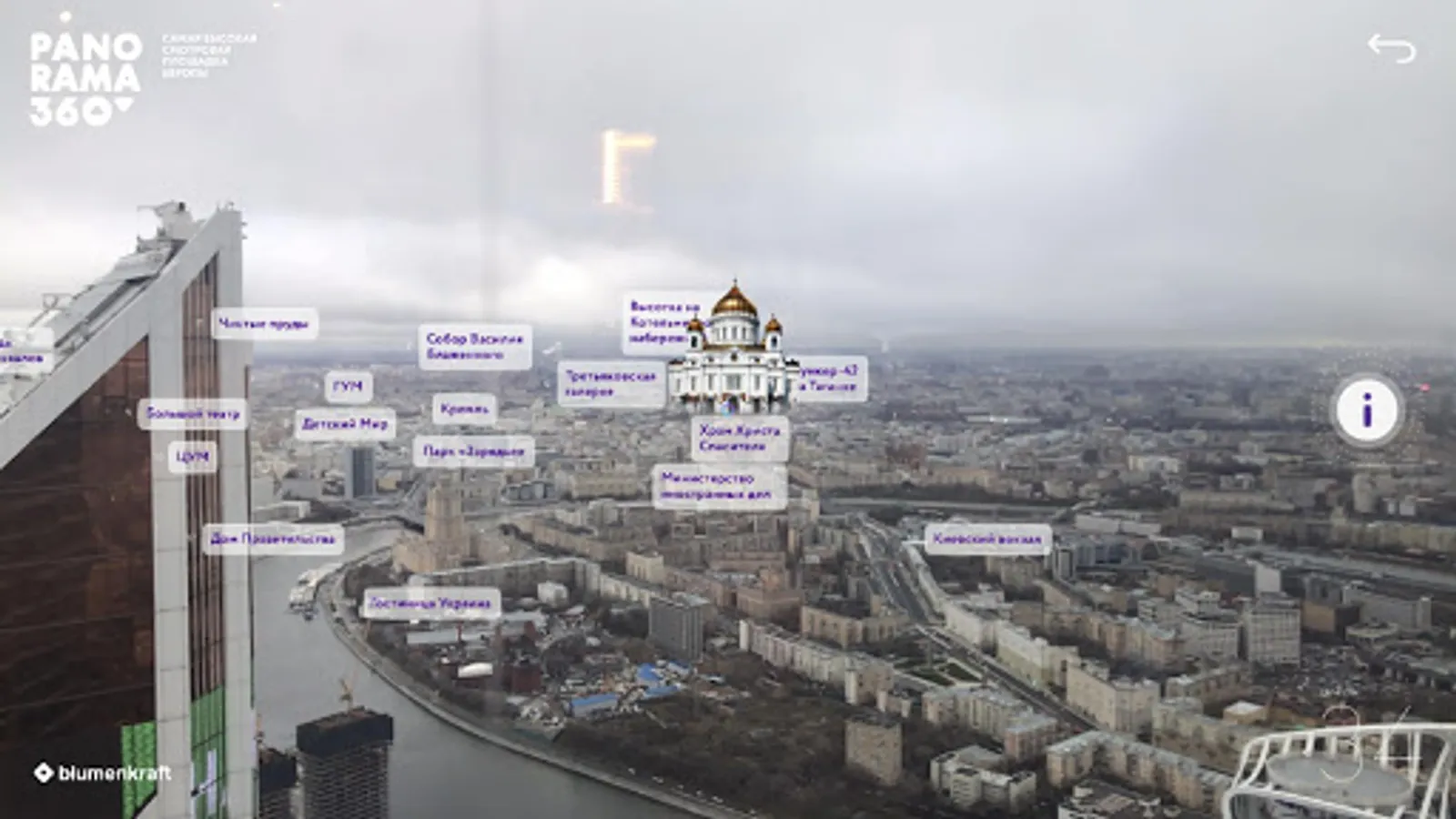 Moreover, the application is easy to use and accessible for both children and older users: just point the mobile device camera to a special image (marker) located on the window frame of the PANORAMA360 observation deck, and you will see in constructed reality the corresponding marks over architectural objects that are in the guidance zone of a mobile device. When you “align” your camera on the city, you will see windows with information pop up over the sights, containing an audio guide, legends about each of the objects, panoramas and 3D animations.