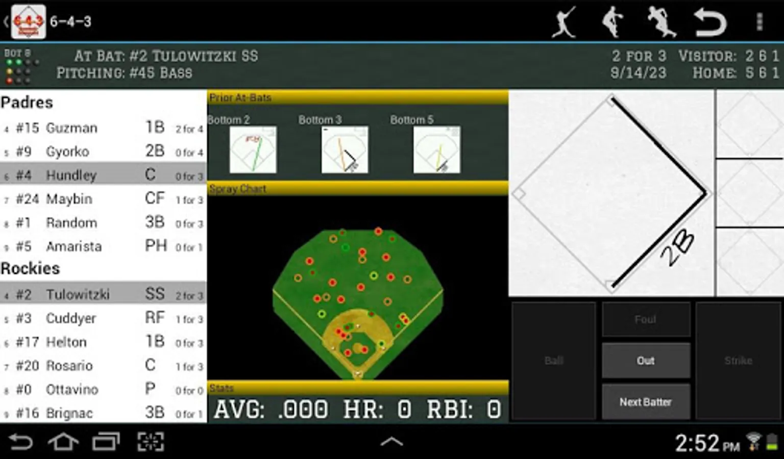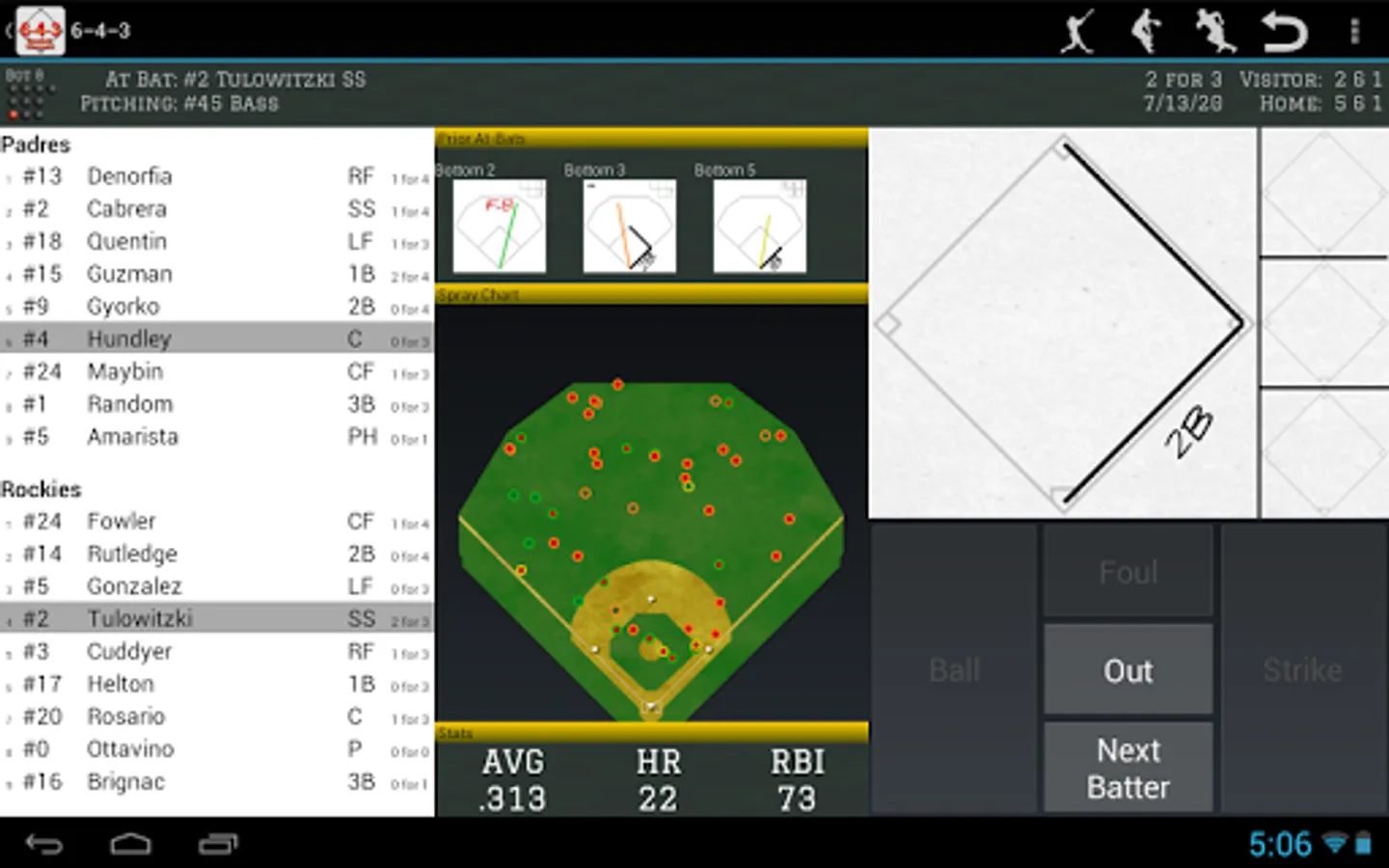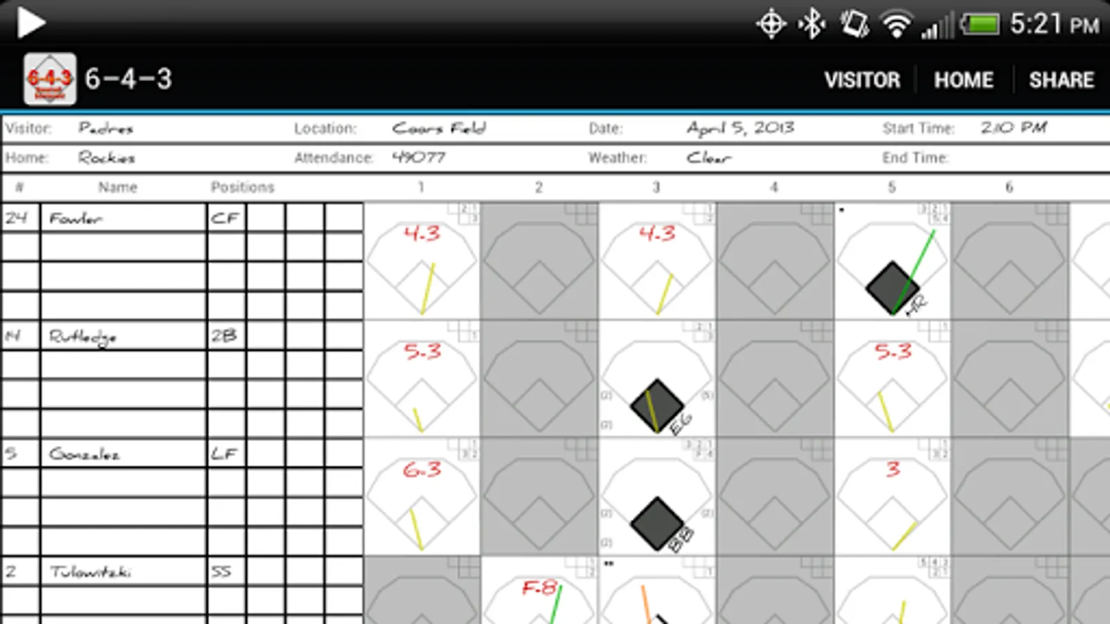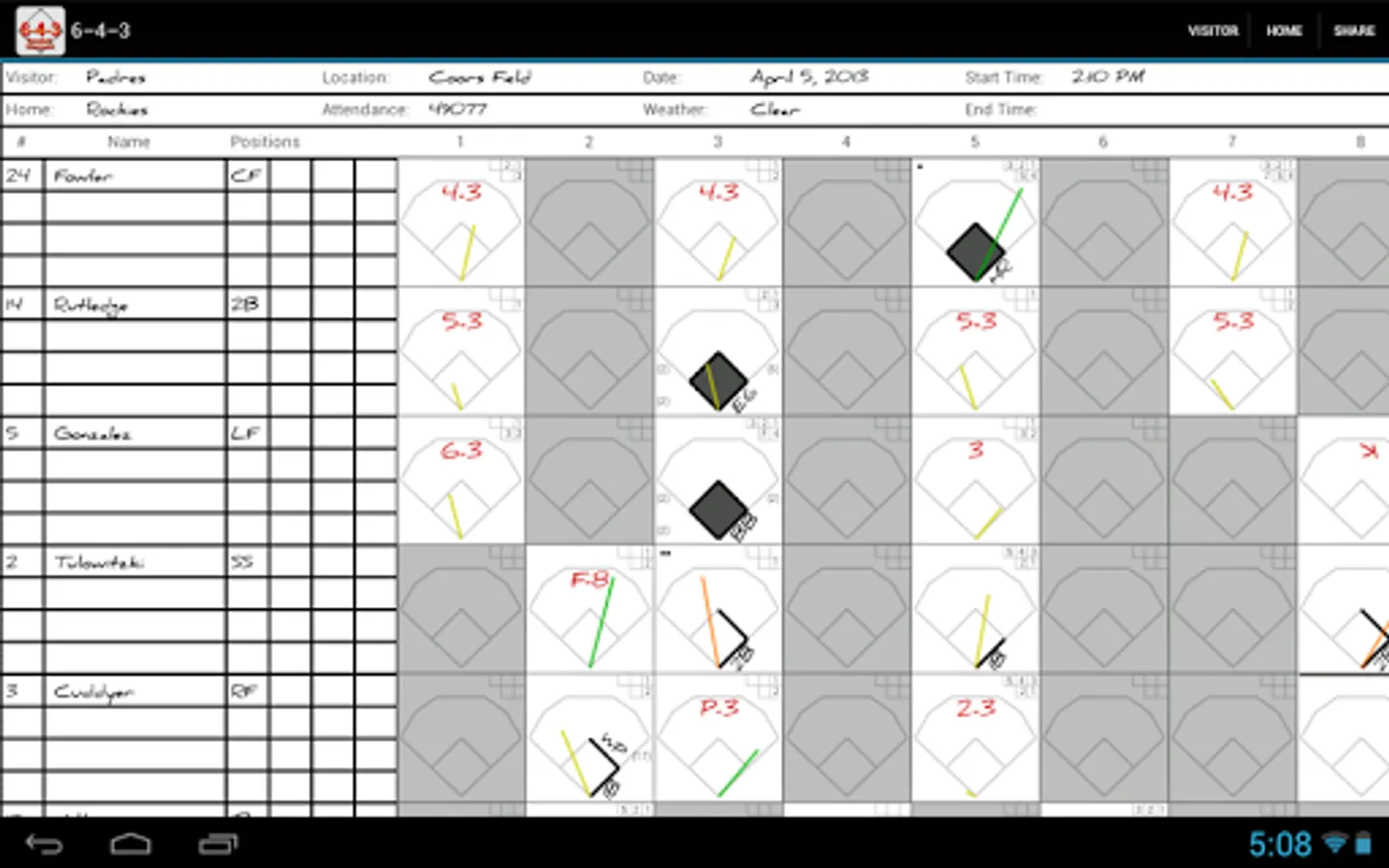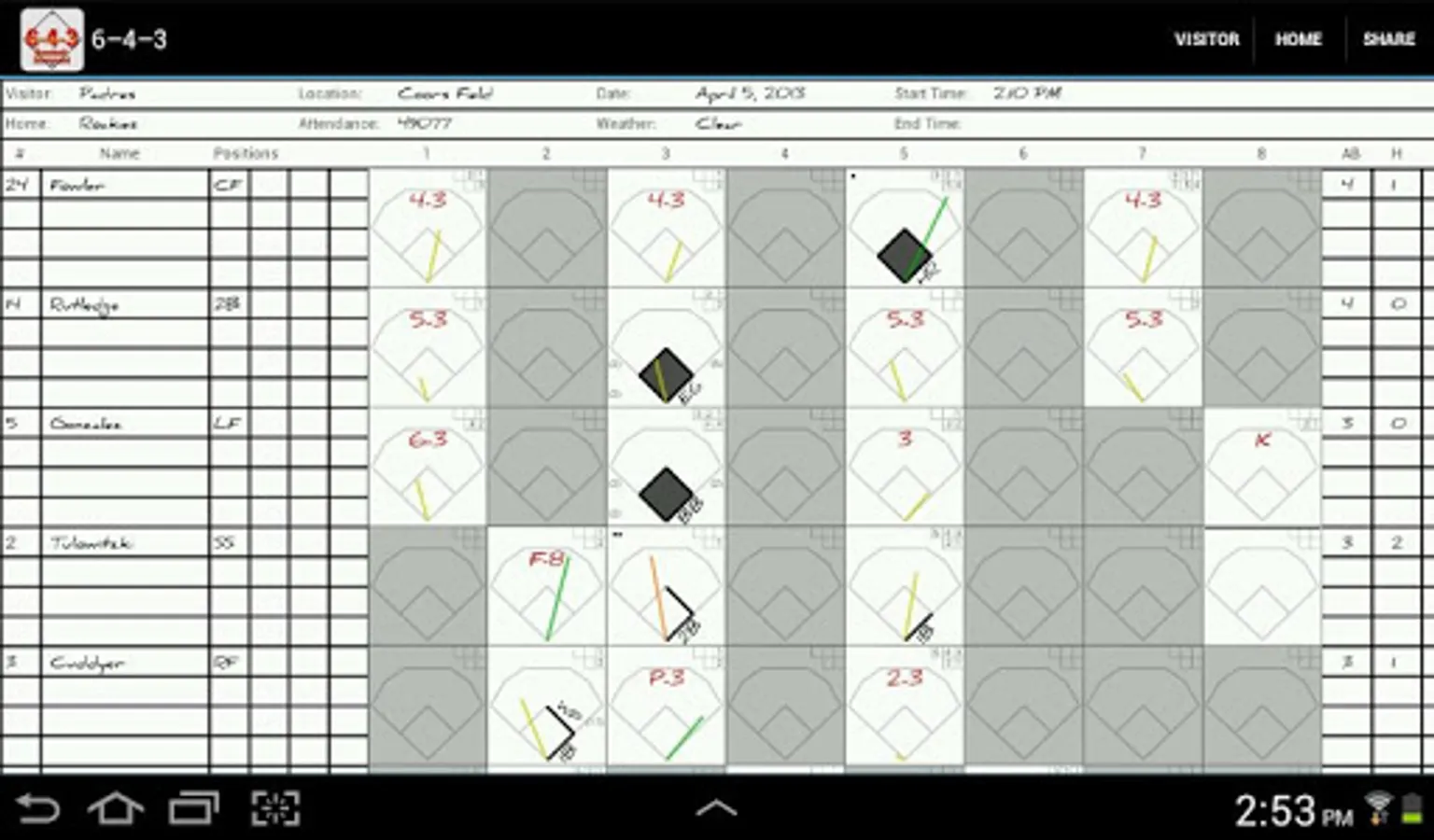 Whether you're a fan who can't imagine going to the park without your scorebook or a coach looking to compile your team's stats, 6-4-3 is the perfect tool. Staying true to the paper-and-pencil feel of a real scorecard, scoring baseball and softball games is fun and easy. 6-4-3 uses the traditional scorekeeping conventions you're already familiar with to help you produce legible, shareable scoresheets as well as advanced statistical analysis of your team's tendencies.