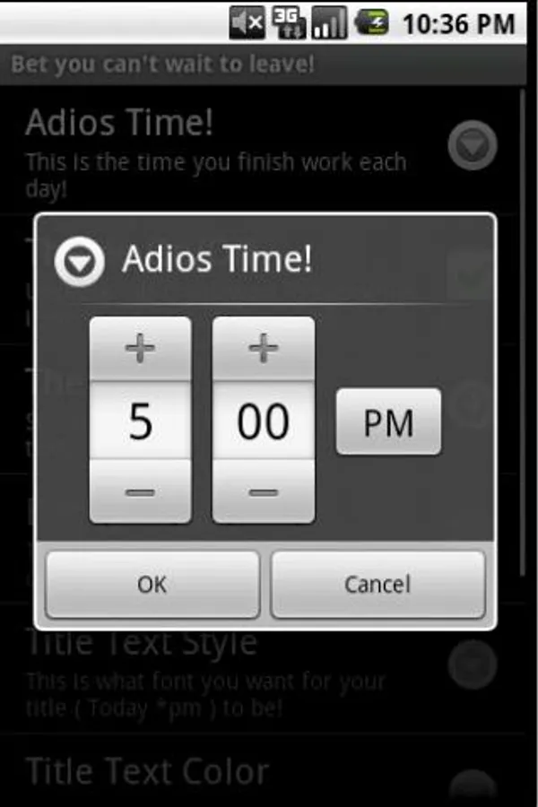Set at 5pm but with the option to change the countdown to when u finish work (Press menu or 0)