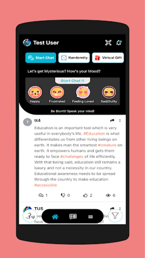 Bluntt is an anonymous social network. It lets you reach out to the people of your life and speak out your mind without the fear of being judged or mistreated! Bluntt believes in giving everyone a platform to let go of all the suppressed emotions and feelings, and communicate freely.