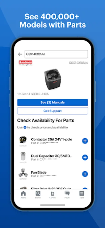 - Database of 500,000+ HVAC units (manuals, part lists, controls, support FAQ)