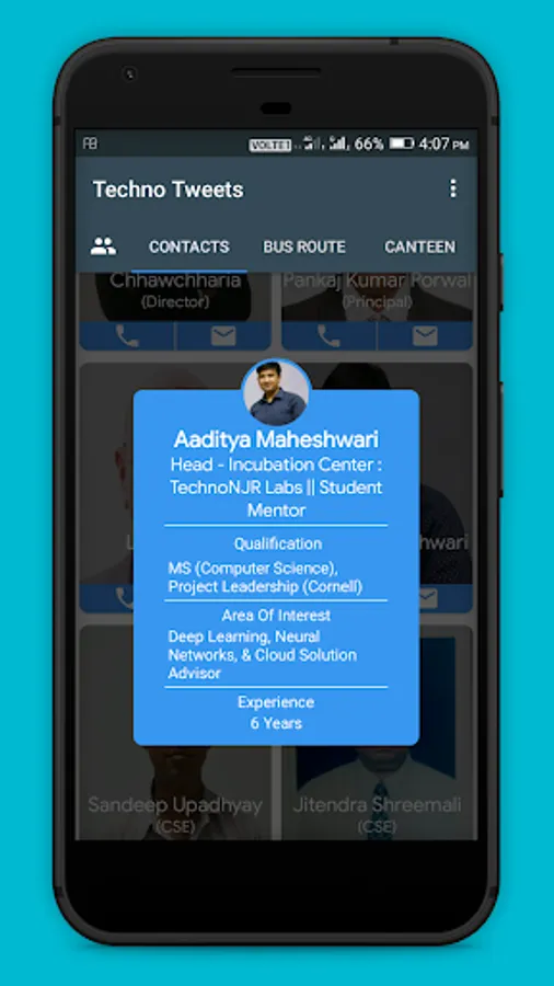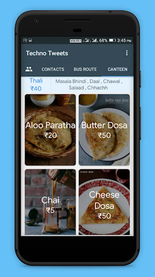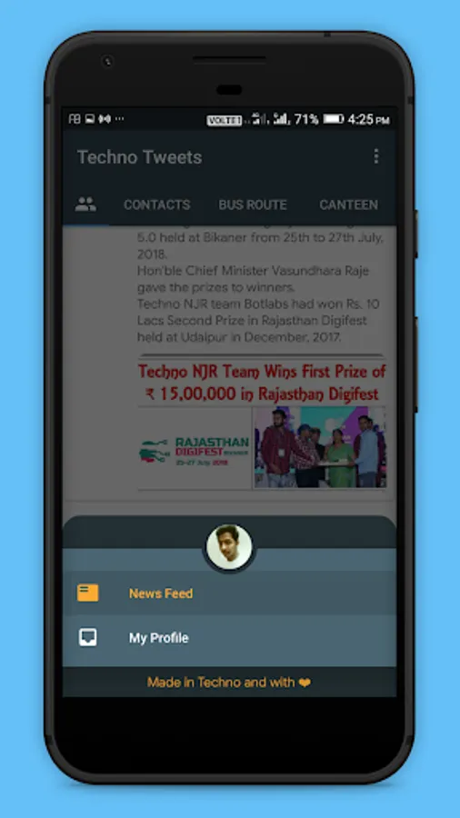Techno Tweets is an exclusive app for Techno India NJR students. This Application is developed to get daily Tech news and articles about latest technology , helpful in getting daily Bus Routes , meals available in canteen and it also provides contact information about all the faculties of College.