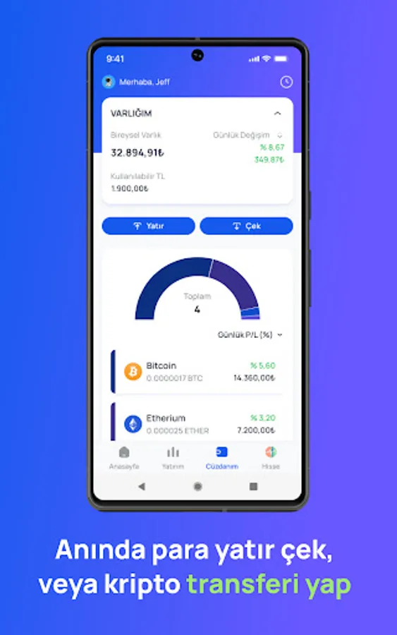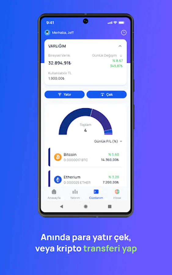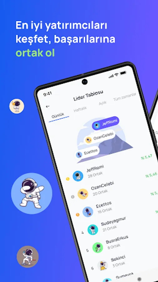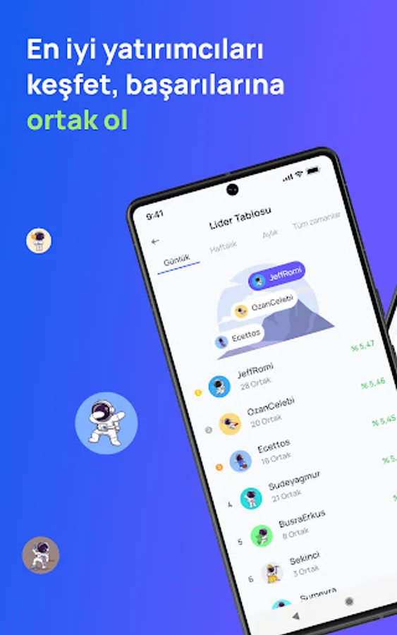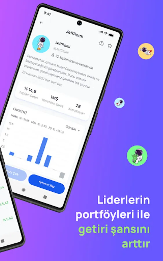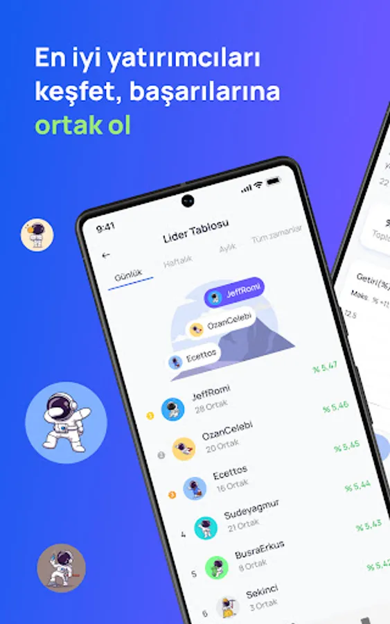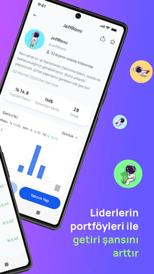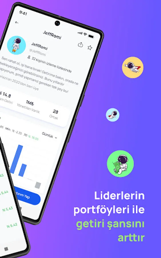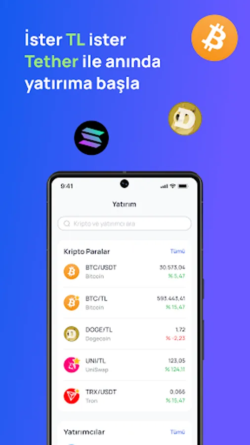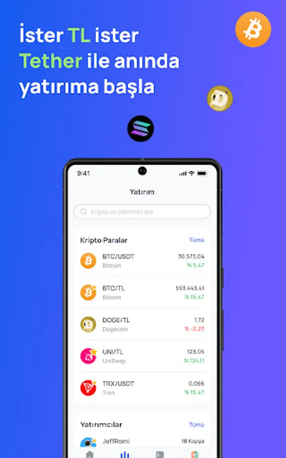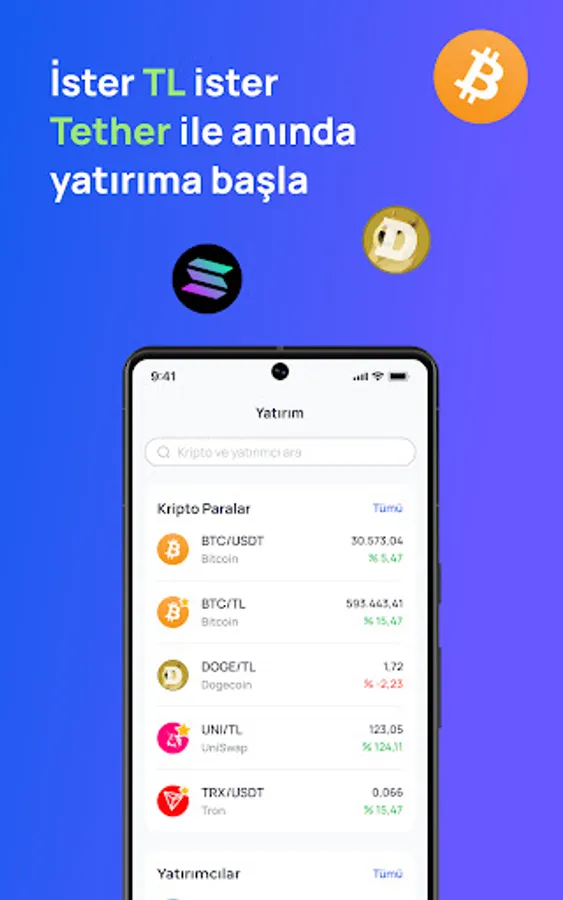 Invest your savings in cryptocurrencies, stocks or top investors. With its simple interface, you can invest in over 60 cryptocurrencies with either Turkish Lira or Tether. If you wish, discover the best traders on the Leaderboards and share in their success. Stocks of Borsa Istanbul will be at the partner very soon. Download partner now and start making crypto investments right now!
