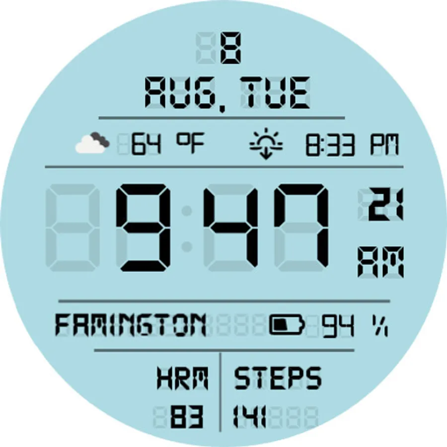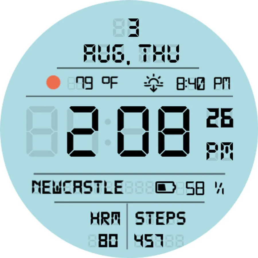 It's a traditional digital watch style watchface with various useful complications like battery status, heart rate, weather, current city name and step counts.