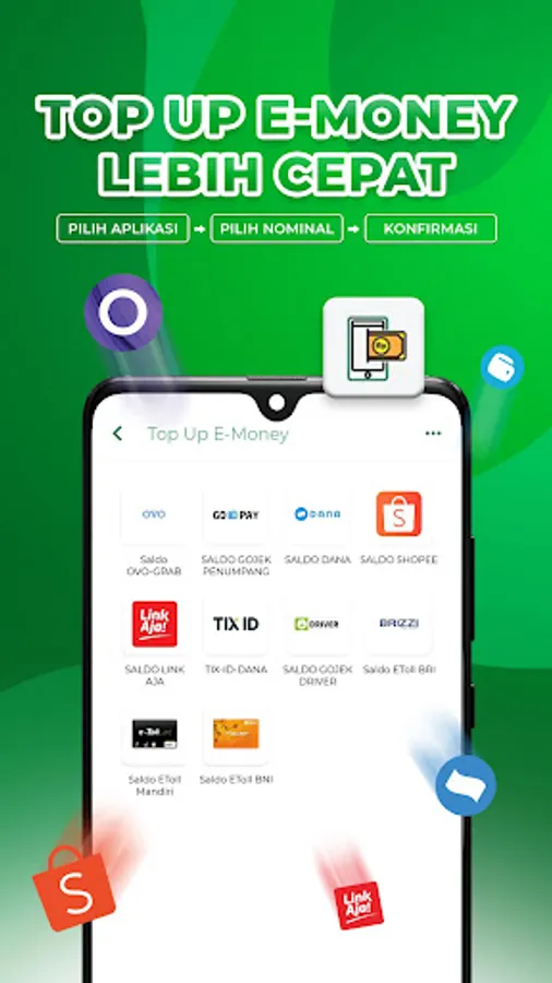 Top up balances: OVO, Gopay, DANA, Speedcash, LinkAja, ShoopeePay, Mandiri, BRI, BNI e-Toll balances.