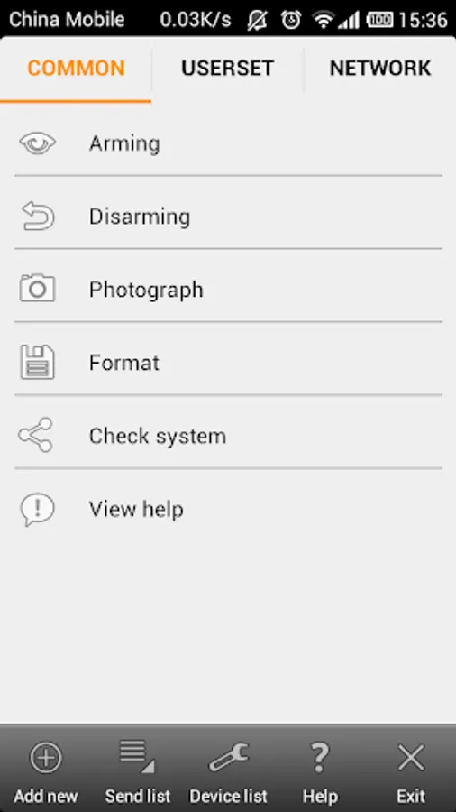 COMMON: Arming,Disarming,Photograph,Format,Check system,View Help;