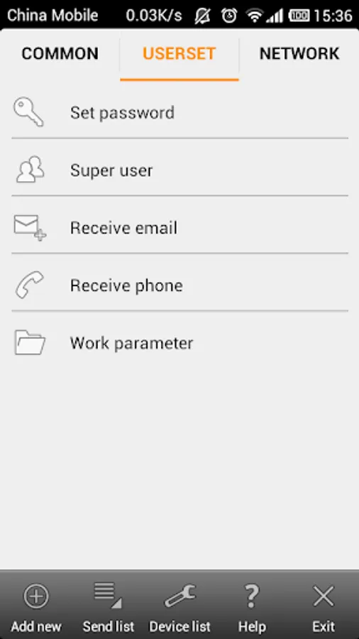 USERSET: Set Password,Super User, ReceiveEmail,Receive Phone, work parameter