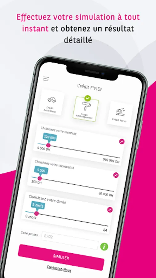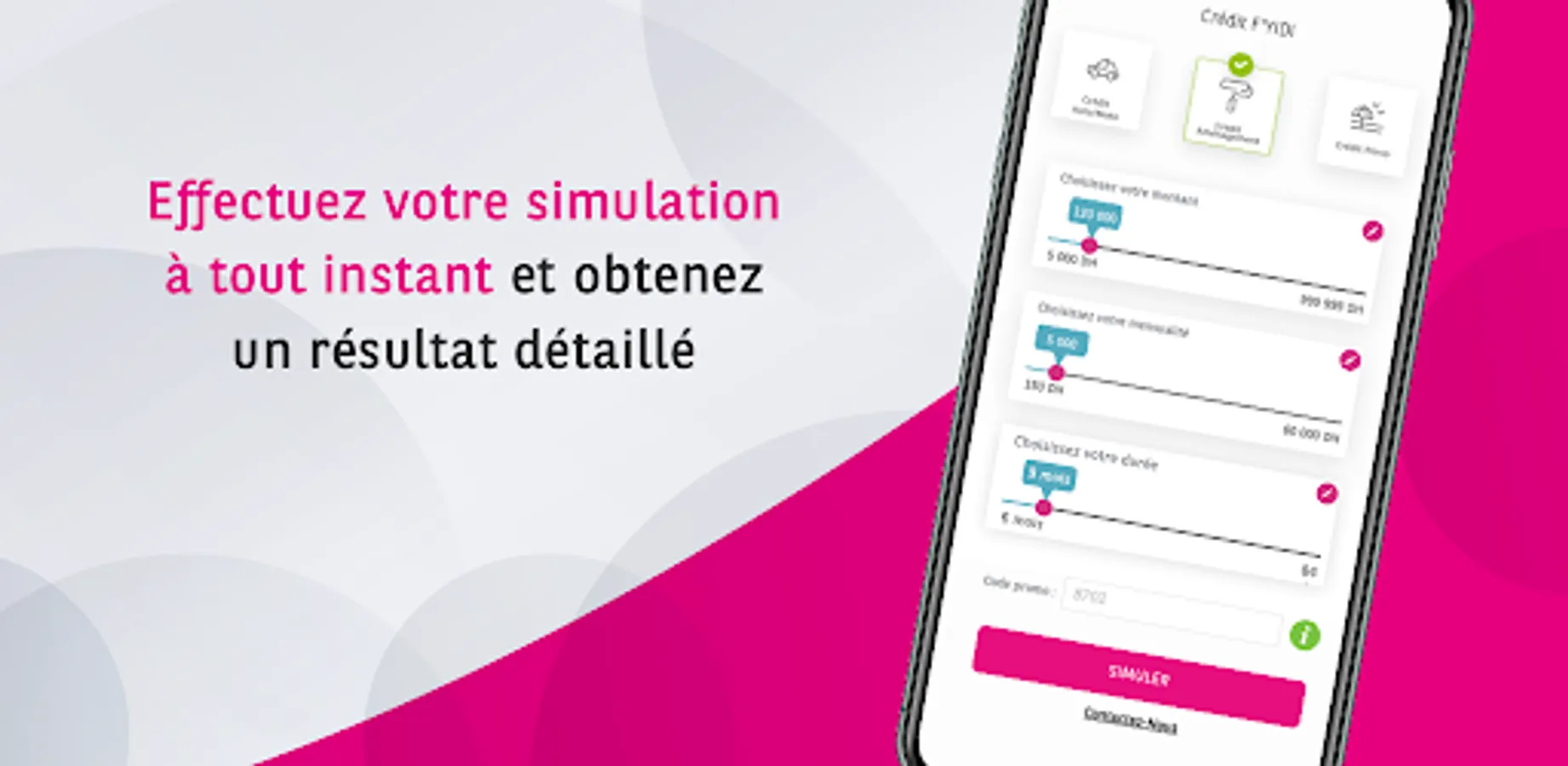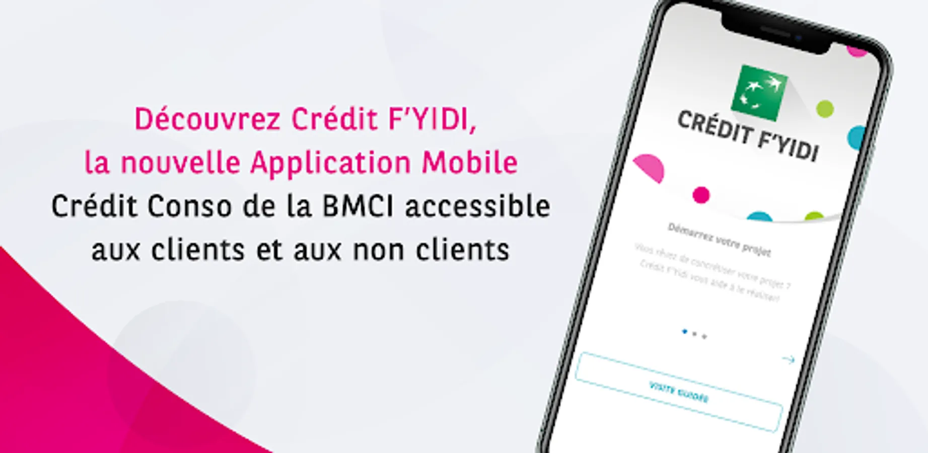 Discover the Mobile Credit Application F'Yidi that accompanies you in the realization of your personal projects! Whether you are a BMCI client or a non-client, the F'Yidi Credit Application allows you to securely perform your credit and credit applications securely.