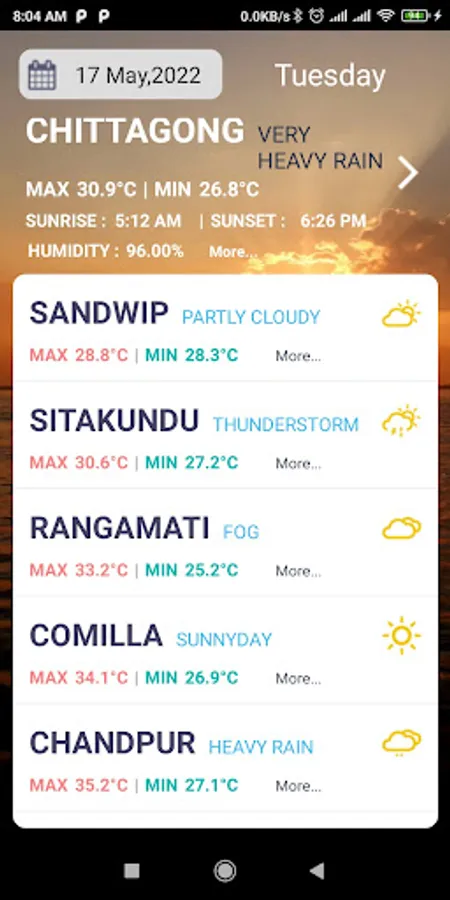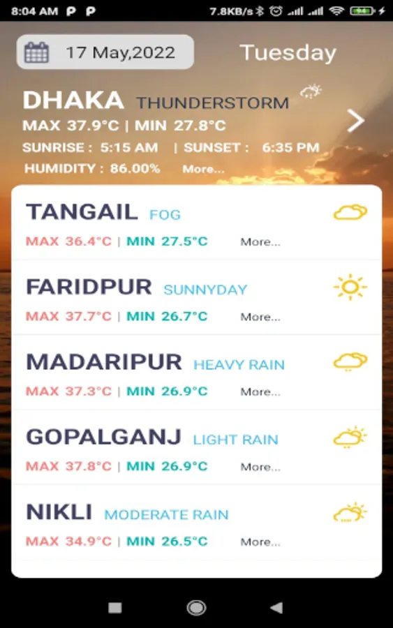 This app is developed under Bangladesh Meteorological Department and its interactive app provides detailed present weather observation and weather forecast for all Bangladesh locations from different division district temperature information like Min,Max temperature , sunrise, sunset, humidity information.