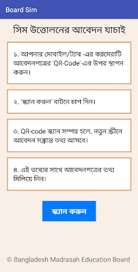 This app is used for the Education Boards of Bangladesh. Each educational institution of Bangladesh is issued an official SIM. To issue a new SIM or to withdraw the lost SIM, an institution has to apply through Education Board website.