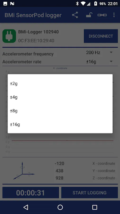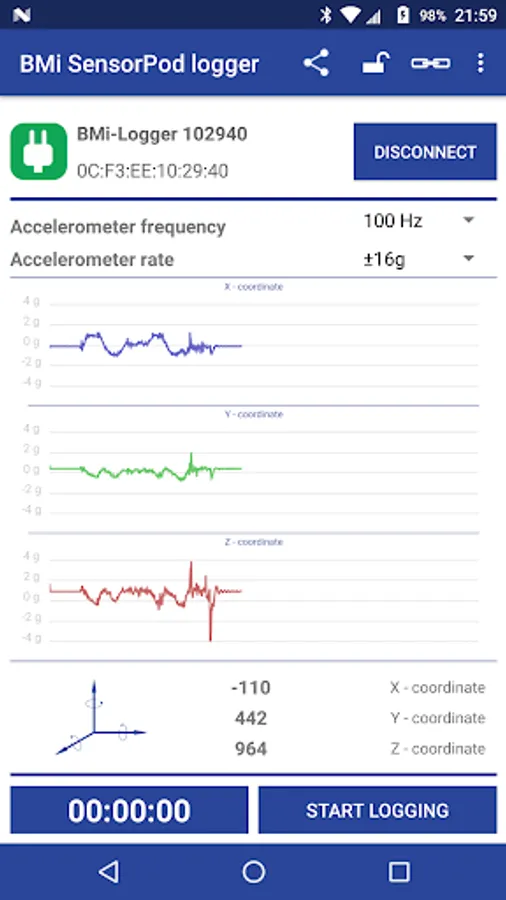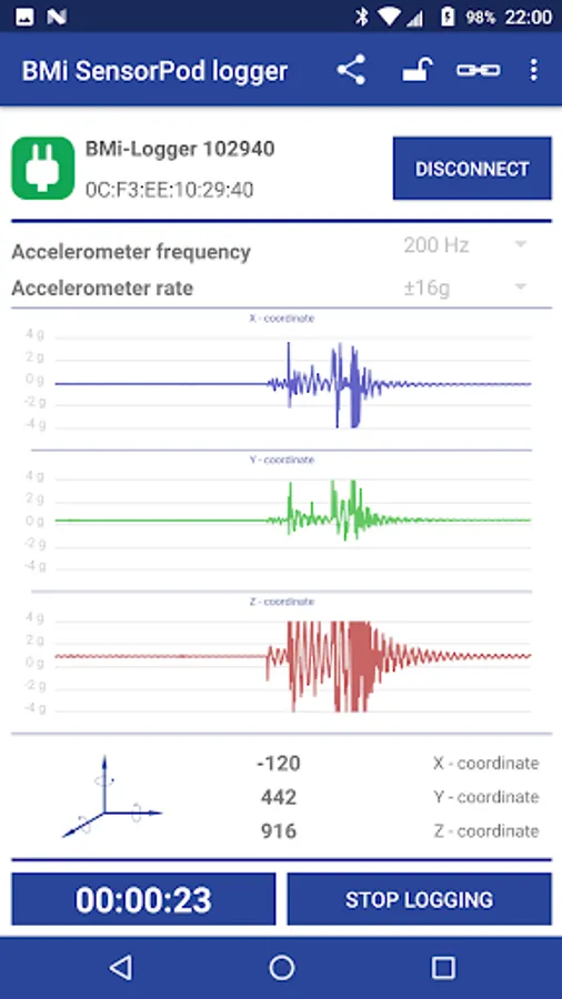 It is the best way to log the acceleration data from the 3D accelerometer that is integrated in BMi SensorPod logger. The format of logged data is CSV file and it can be shared via email, dropbox, google drive, etc. The SensorPod can be configured for ranges 2g, 4g, 8g, 16g with sampling frequencies 1.6Hz, 12.5Hz, 25Hz, 50Hz, 100Hz, 200Hz.