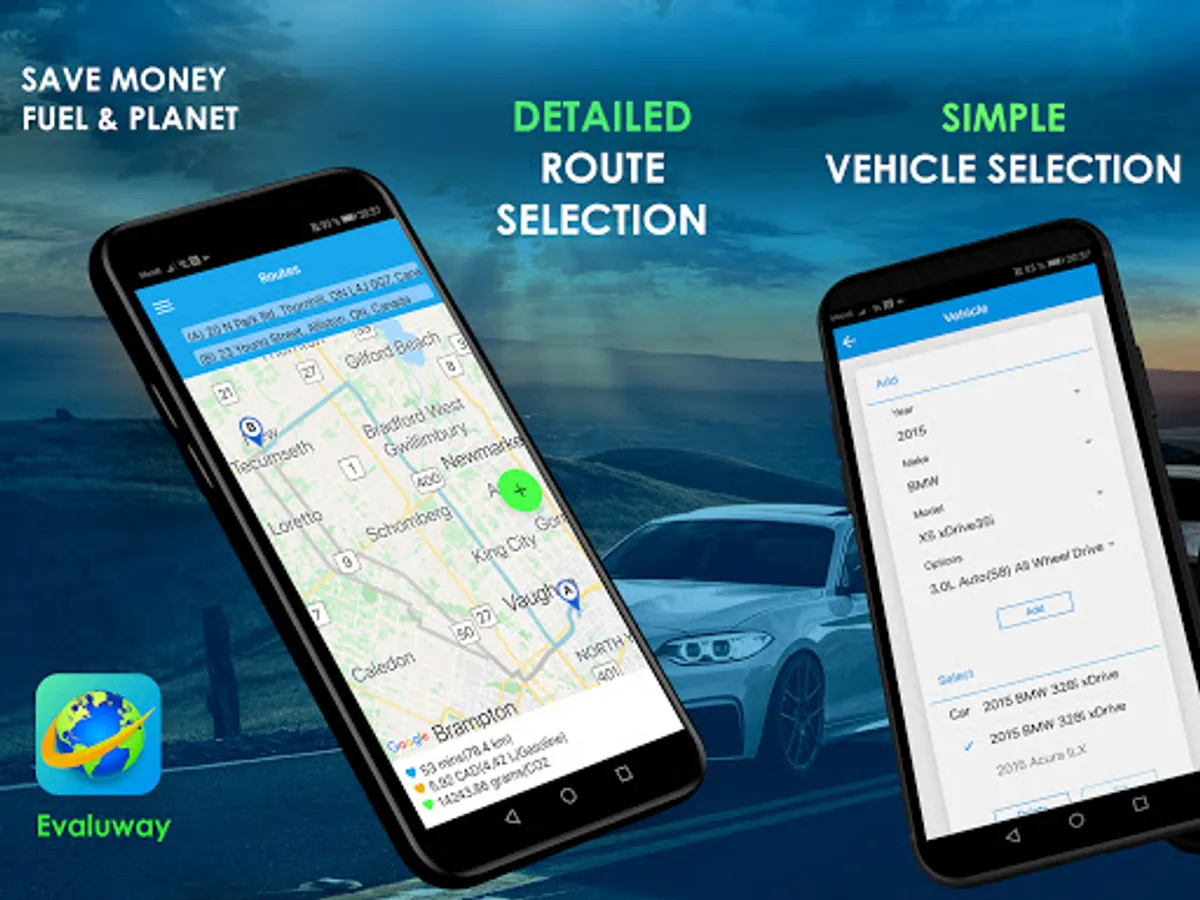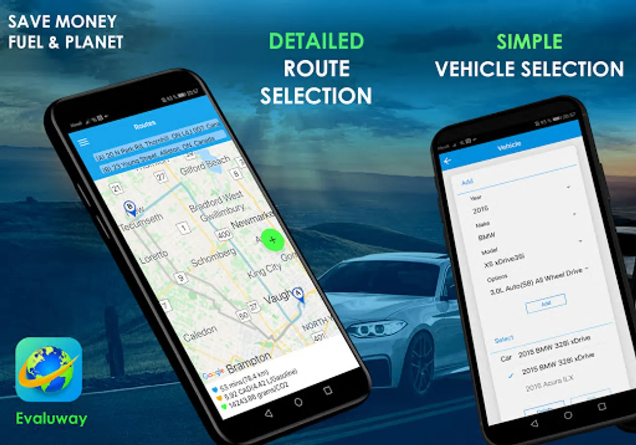 Reduce your car carbon emissions, save fuel and money with Evaluway — the first (and only) route planner that gives you a pre-departure listing of the best routes to maximize fuel efficiency, cut down on co2 emissions, and predict your fuel usage 🌳 ☀️