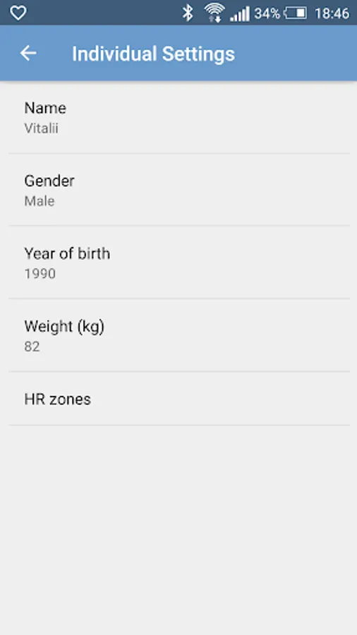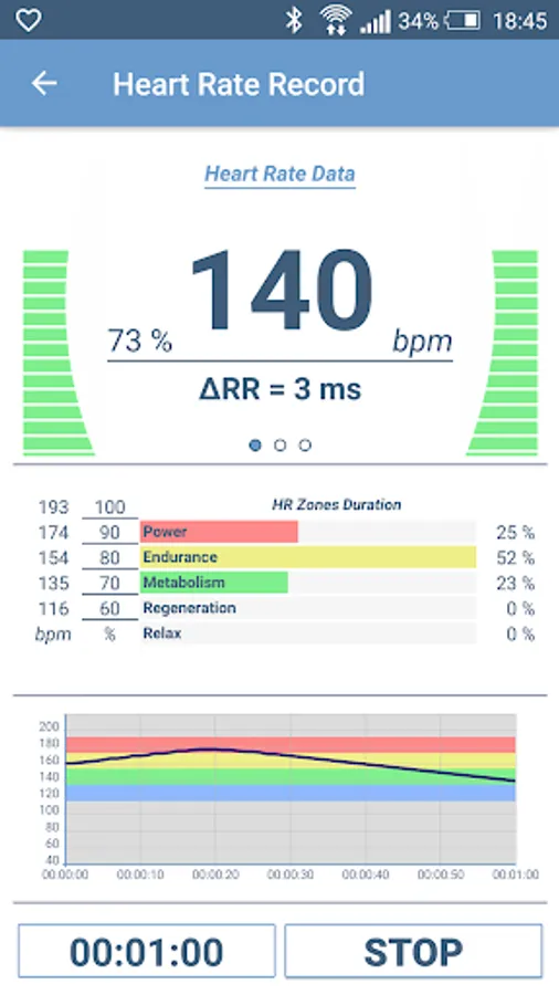 After the configuration of the individual settings and training zones, and a connection to the chest belt the heart rate is visualized as an absolute value of beats per minute and as a percentage of the stored maximum heart rate value of the user. Additionally, the deviation (variability) of the separate heart beats is displayed in milliseconds. The different training zones are individually colored and easily comprehensible.