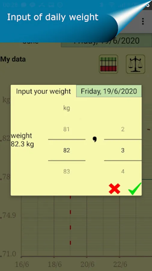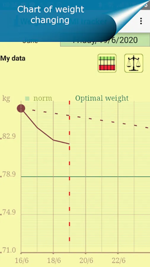 A weight diary keeps all the results of your daily weigh-ins. You always are able to see your weight changes on charts or in a handy, editable table. As a result, your weight is effectively monitored and controlled.