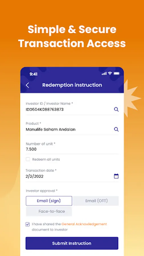 View list of mutual fund products and check its performance easily so you can recommend your pick to clients. Create transaction and check clients’ portfolio without trouble for easy progress management. Clients’ approval and verification for any transaction are mandatory to ensure security.
