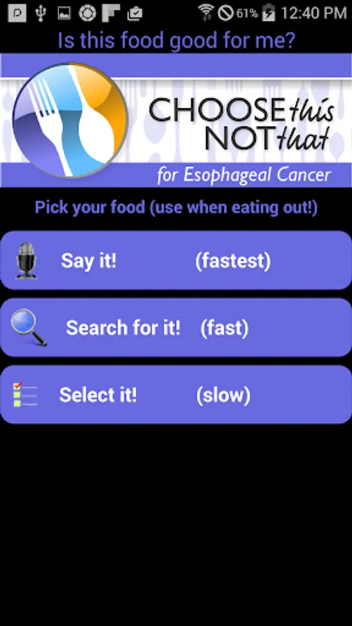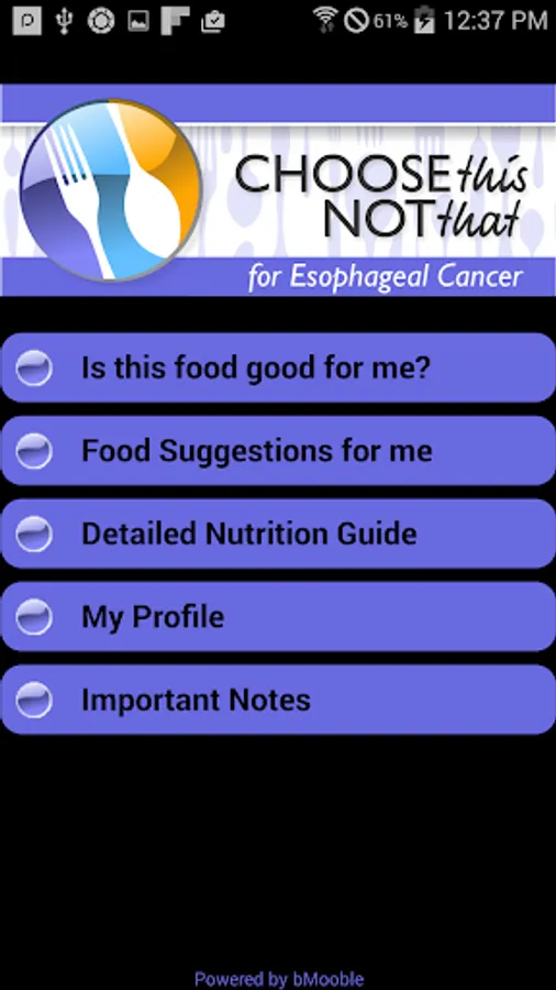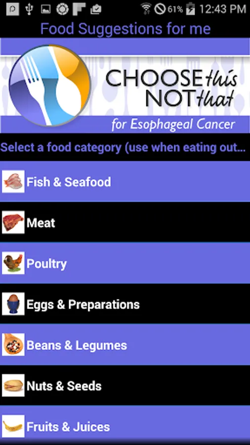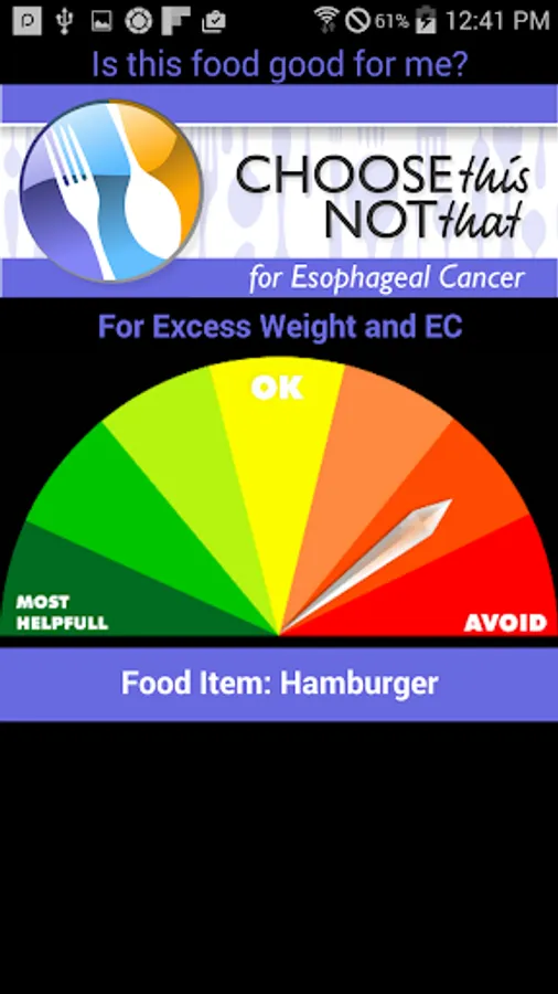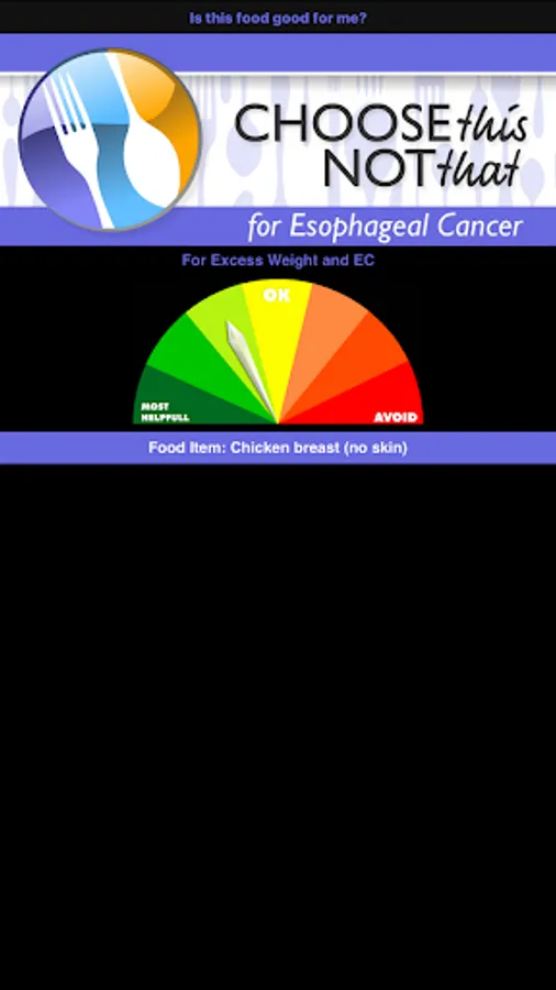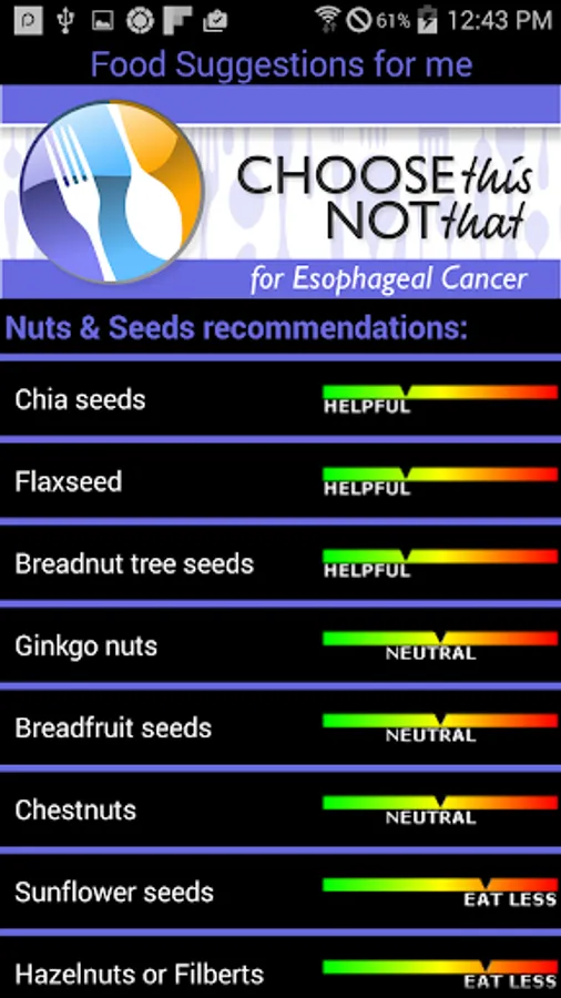 Choose This not That for Esophageal Cancer. Inside this colorful app, you will find easy to follow suggestions on how to improve your health through nutrition and the food choices you make every day. This app provides comprehensive and actionable nutrition guidelines for how to prevent and combat Esophageal Cancer (cancer of esophagus). If you rather tackle health issues through proper nutrition and lifestyle changes then this app is for you! Last data update: Dec. 2019.