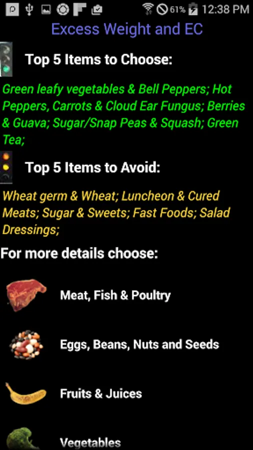 • ACTIONABLE information on what is good, what is bad, and what is neutral for your condition(s). We single out specific food items, and give you an ordered list of helpful and harmful foods within each food group.