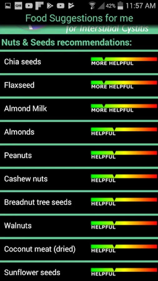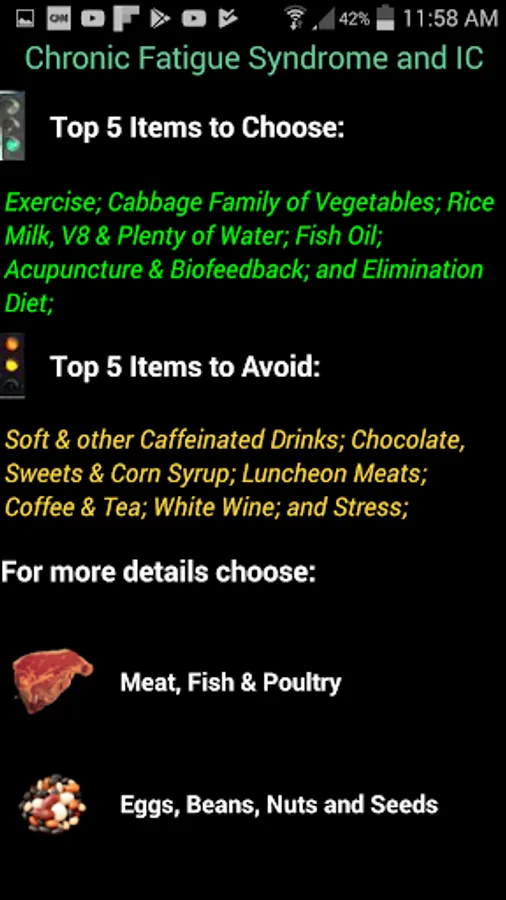 • ACTIONABLE information on what is good, what is bad, and what is neutral for your condition(s). We single out specific food items, and give you an ordered list of helpful and harmful foods within each food group.