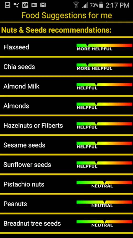 • ACTIONABLE information on what is good, what is bad, and what is neutral for your condition(s). We don't just point you to a food group. We single out specific food items, and give you an ordered list of helpful and harmful foods within each food group.