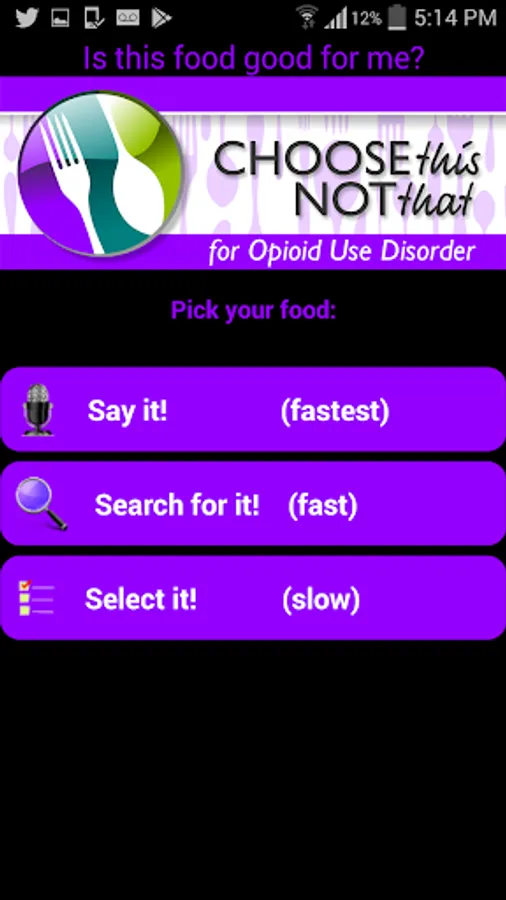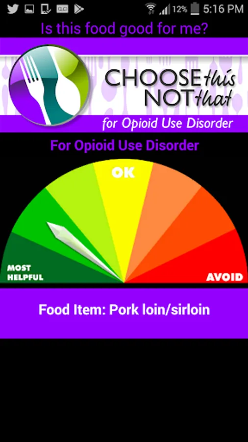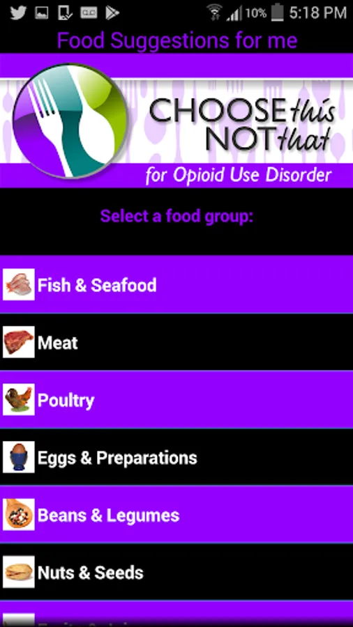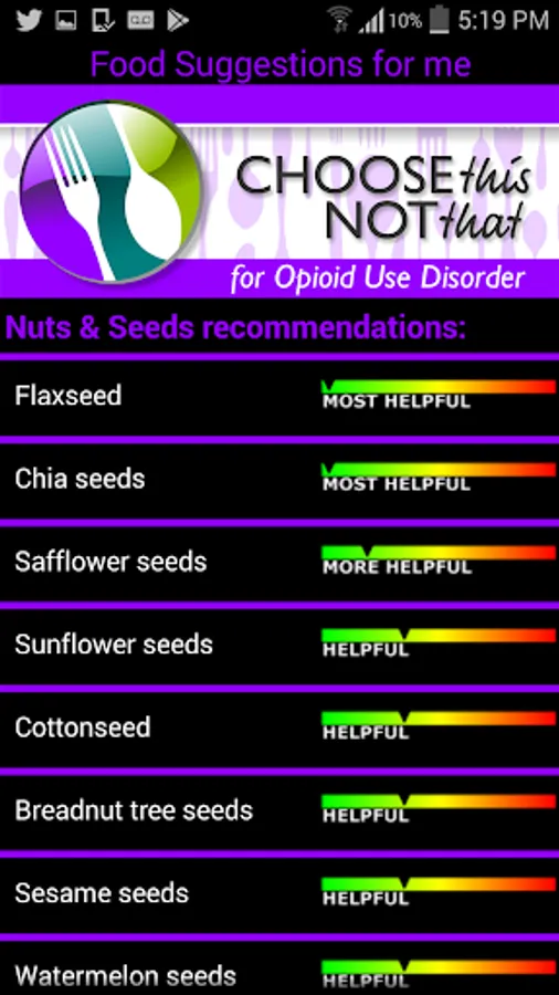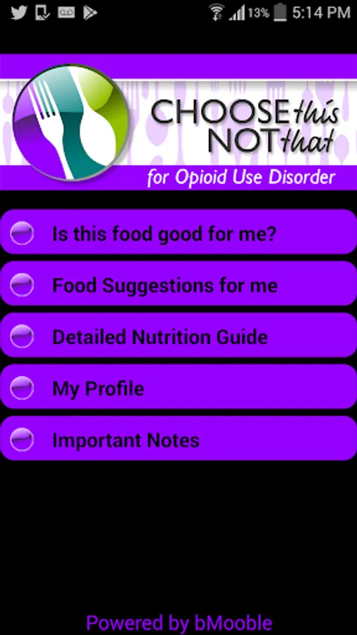 Choose This not That for Opioid Use Disorder (OUD). Inside this colorful app, you will find easy to follow suggestions on how to improve your health through nutrition and the food choices you make every day. This app provides comprehensive and actionable nutrition guidelines for how to improve your health and nutrient deficiencies while recovering from opioid addiction. If you rather tackle health issues and risks through proper nutrition and lifestyle changes then this app is for you! Last Update: Dec. 2019.