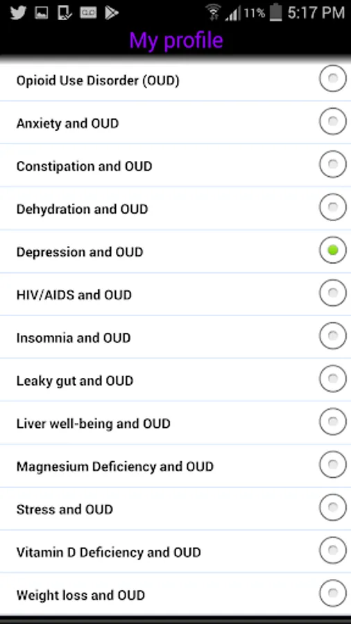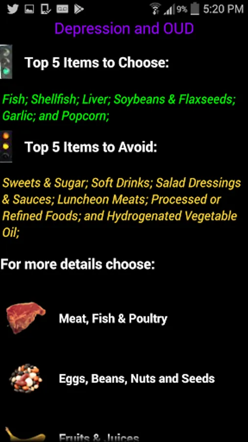 • This app offers dietary guidance for OUD AND its combination with the following most likely health issues: anxiety, constipation, dehydration, depression, HIV/AIDS, insomnia, leaky gut, liver well-being, magnesium deficiency, stress, vitamin D deficiency and weight loss.
