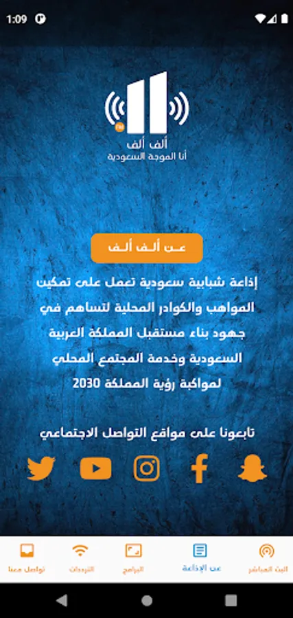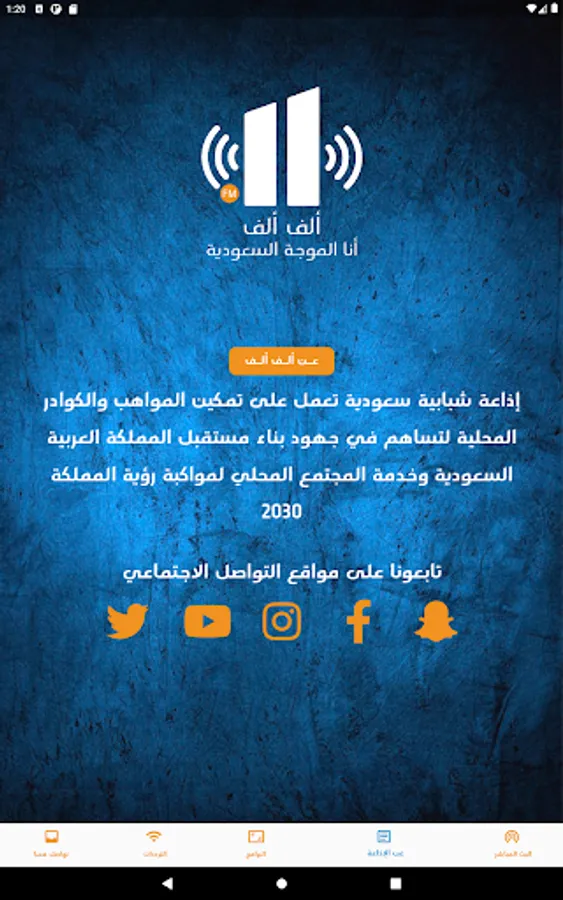 Alef Alef FM Radio is a Saudi youth radio that works to empower local talents and cadres to contribute to efforts to build the future of the Kingdom of Saudi Arabia and serve the local community to keep pace with the Kingdom’s 2030 vision.