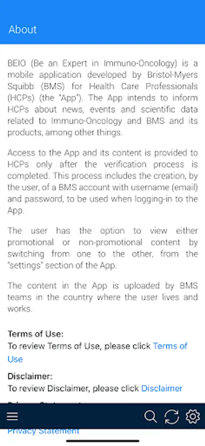 BEIO (Be an Expert in Immuno-Oncology) is a mobile application developed by Bristol-Myers Squibb (BMS) for Health Care Professionals (HCPs) (the “App”). The App intends to inform HCPs about news, events and scientific data related to Immuno-Oncology and BMS and its products, among other things.