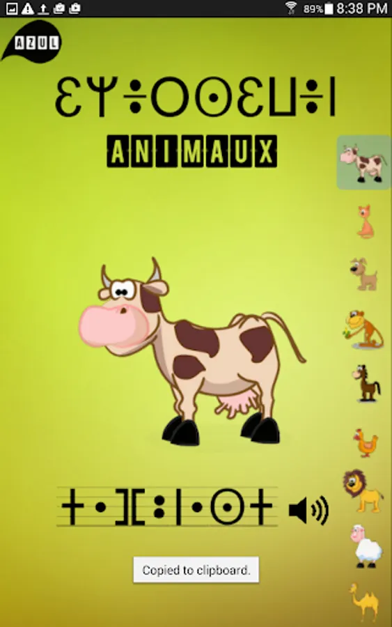 Une liste de douze animaux bien choisis. Chaque animal est représenté par une image. Son nom est écrit et lu en tamazight.