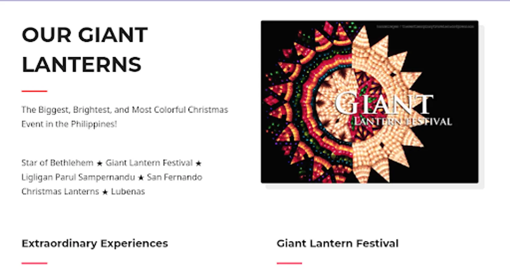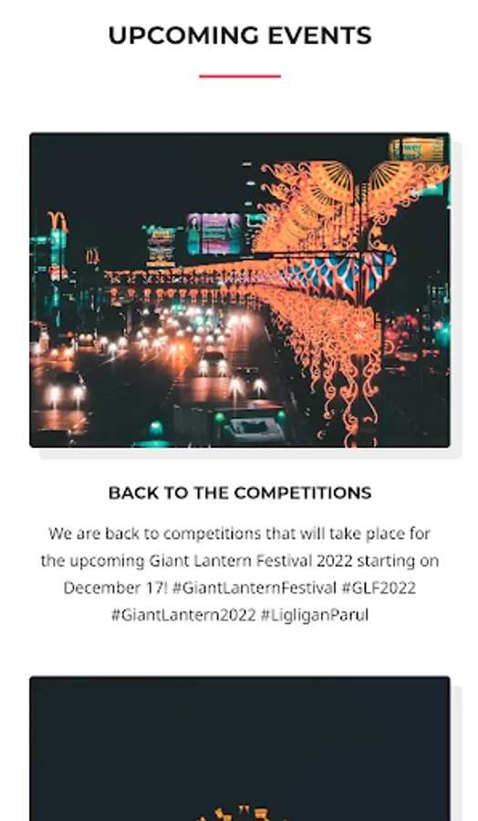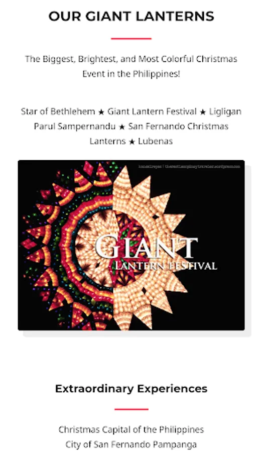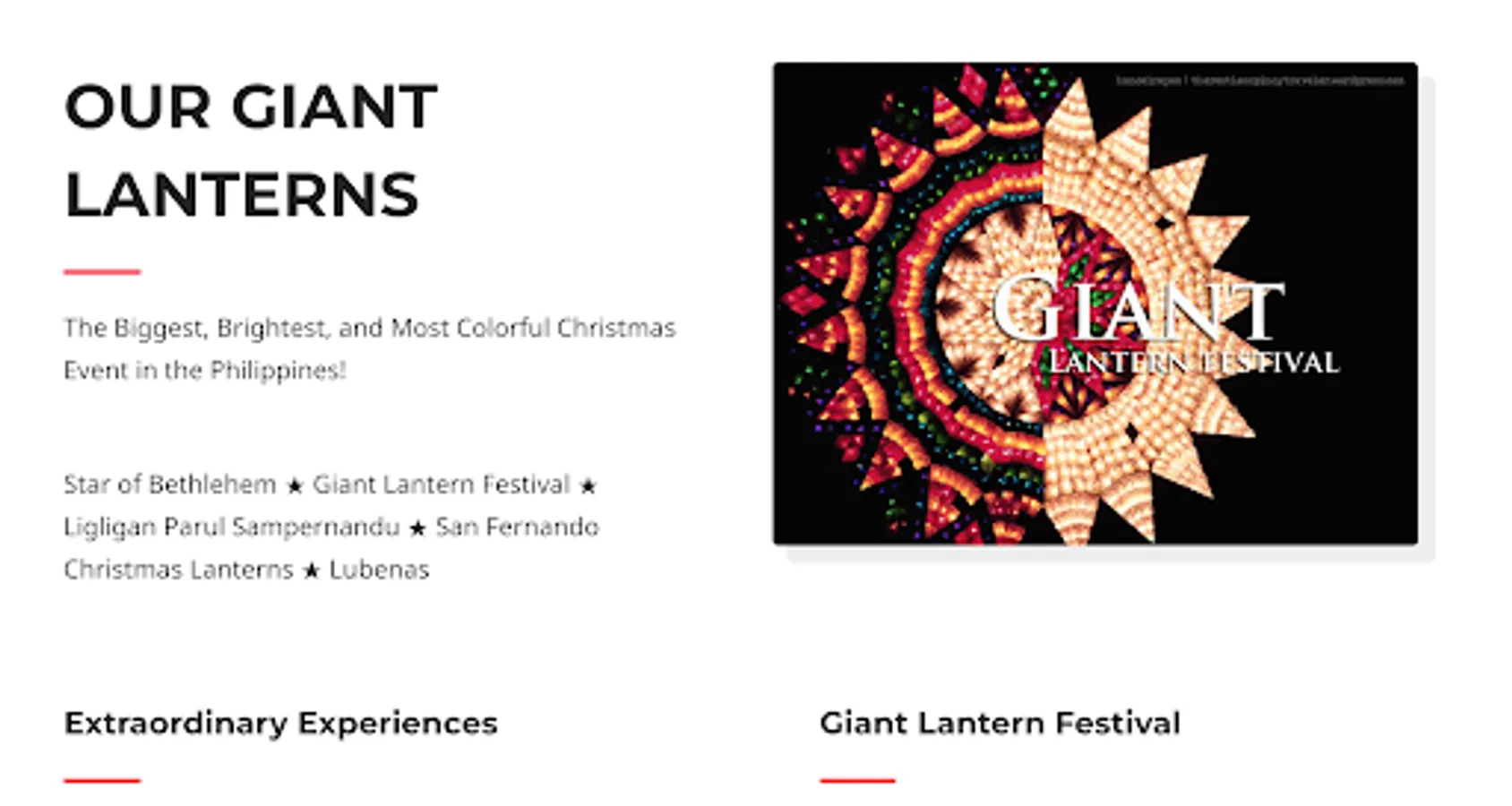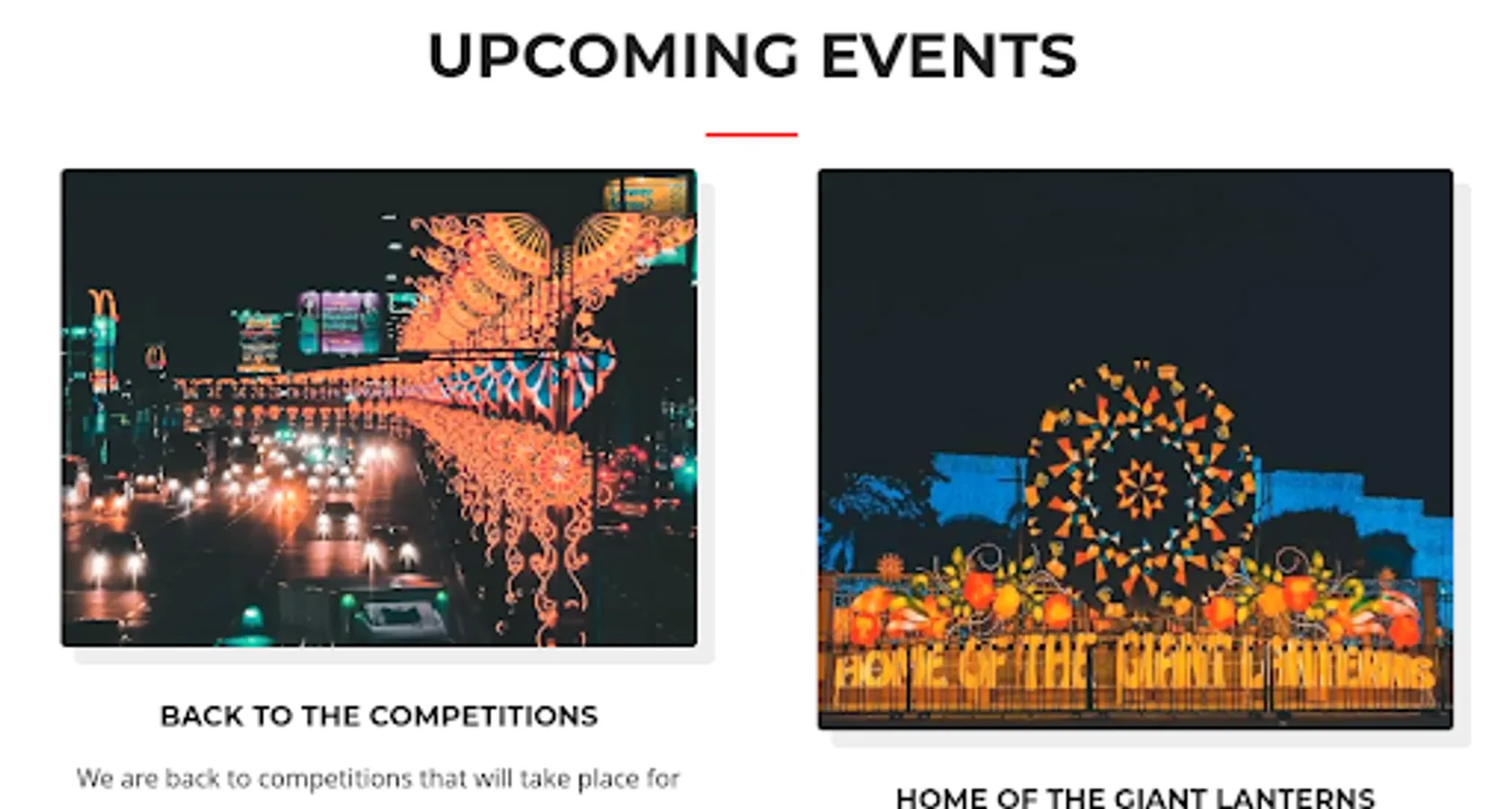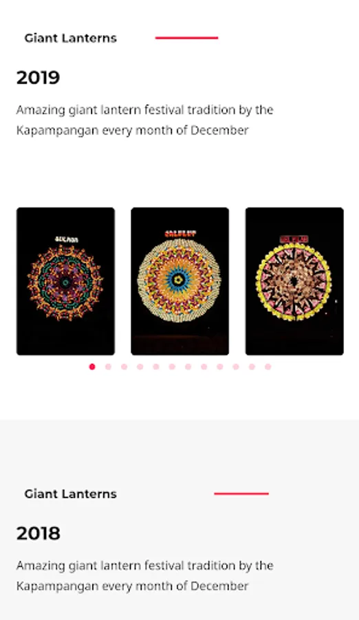 The Giant Lantern Festival Mobile App is a information provider about the Giant Lantern Festival that is an annual festival held in mid-December in the City of San Fernando in the Philippines. The information that will be held in this application are the information about the festival itself, upcoming events which is a competition of Giant Lanterns, sponsors, FAQs, etc.