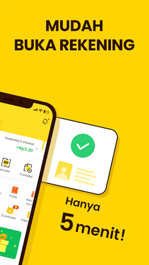 The neobank application is an online savings and deposit application from Bank Neo Commerce (BNC). Present since 1990 under the name Bank Yudha Bhakti (BBYB), we have transformed into the first neobank in Indonesia, where all customer banking activities can be carried out digitally.