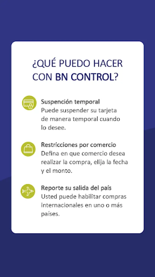 BN Control allows corporate users to have full control over the restrictions on the use and purchase of their credit cards, allowing them to decide when, how much, what days of the week, which merchants? How often? and In what geographical areas? BN Control is a revolutionary patented cloud-based technology that offers banks and their customers an easy-to-use platform to manage commercial transactions.