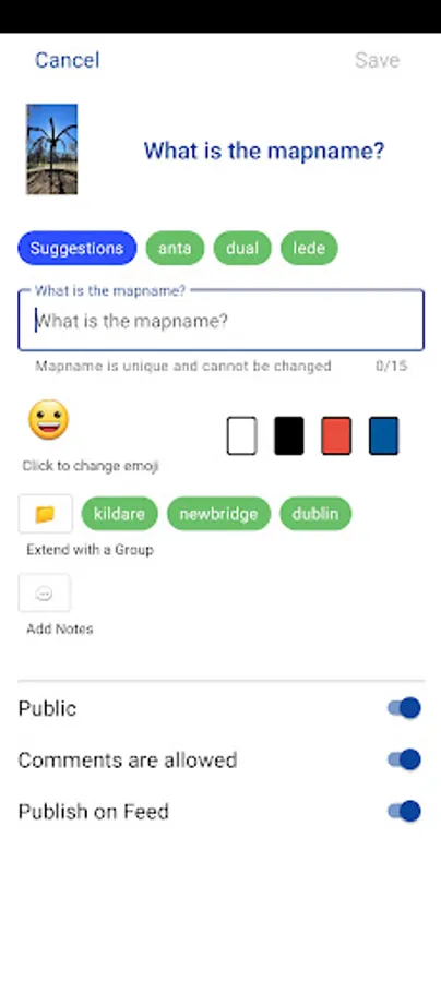 Once you invent a mapname you may prefer to associate that place with an emoji, then this emoji will be marked in your map.