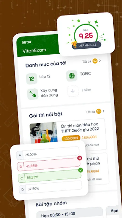 Provide exam questions with banks of hundreds of thousands of questions; support learners to assess their learning capacity; identify areas of limited knowledge through multiple-choice tests; Create an online game room with friends and the community.