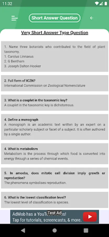 Looking for an app to help you prepare for your Class 11 Biology exams? Look no further! Our app provides comprehensive chapter-wise notes, short-question answers, and MCQs tests to help you ace your biology exams. With easy navigation and user-friendly interface, it's the perfect study tool for high school students. Download now and start mastering biology!