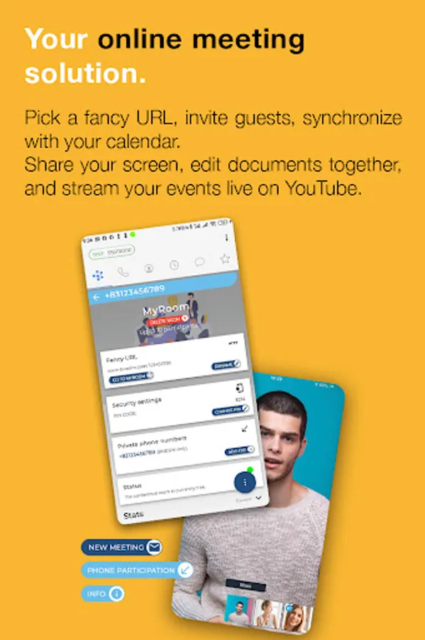 Plan the meeting, pick a fancy URL, invite guests, and synchronize with my calendar. You can access your room from the virtual sim app, a browser, or a call. Add users by calling their phone numbers directly from the room. Share your screen, edit documents together, and stream your events live.