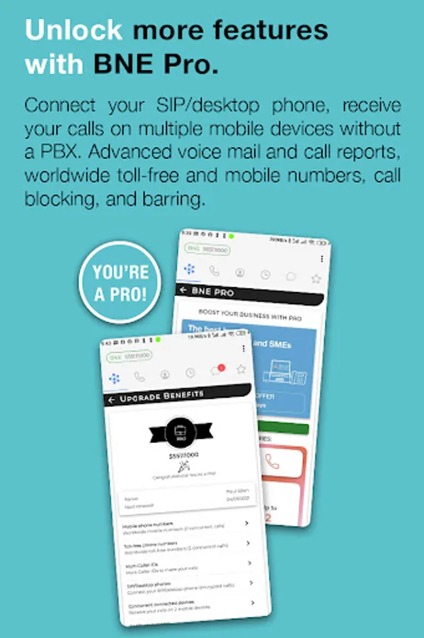 Connect your SIP/desktop phone, receive your calls on multiple smart devices without a PBX, and make your calls from any of the visible mobile numbers. Advanced voice mail, call reports, worldwide toll-free numbers, call blocking, and barring. Welcome to BNE Pro.