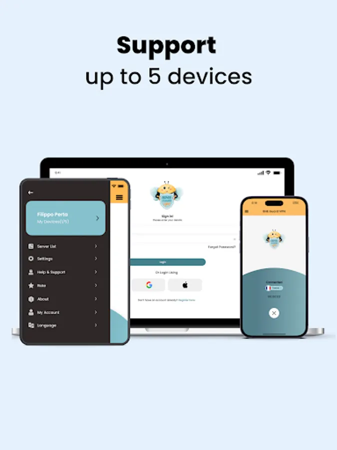 With one account, you can connect up to five devices at the same time, so you can protect your smartphone, tablet, laptop, and other devices all at once.