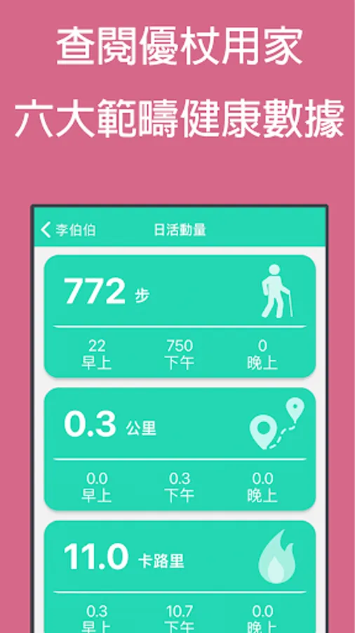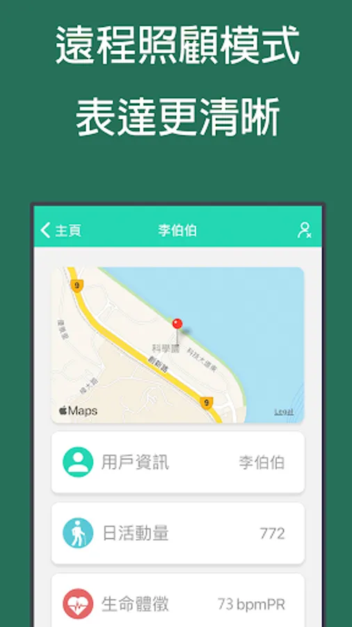 When the caregiver is added to the contact list of the "UZe" user, the caregiver can browse the basic information of the "UZe" user through the app, such as walking distance, calories burned by activities, "UZe" "Remaining battery and location, etc. In addition, caregivers can also use the app to receive fall notification messages from users of "Uzhang" so that they can quickly assist.