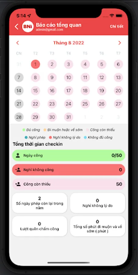 ✅ Management of attendance reports: Number of leave days remaining in the year; Total number of minutes late; Total number of minutes to go early; View the attendance time of any day