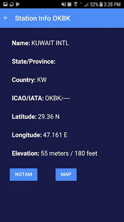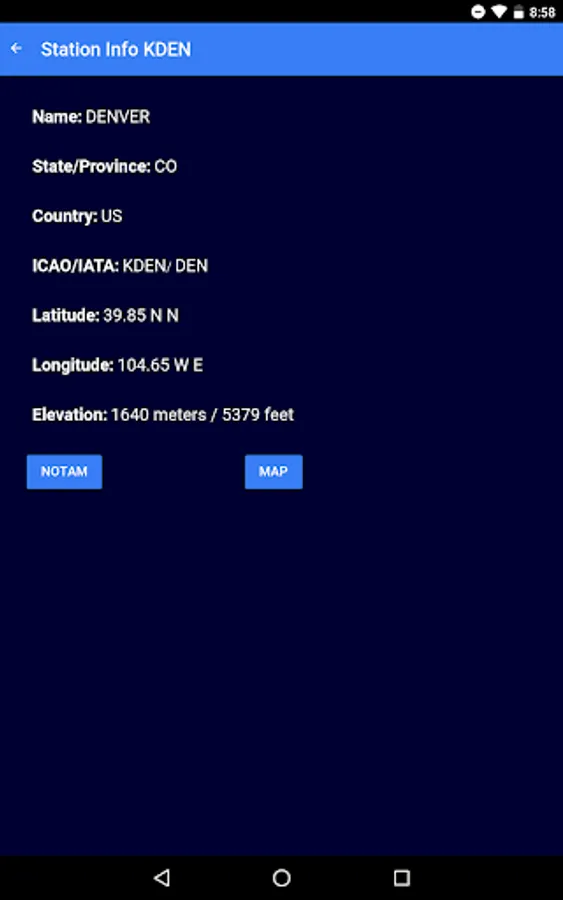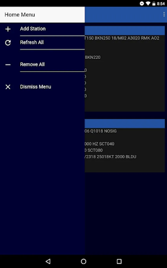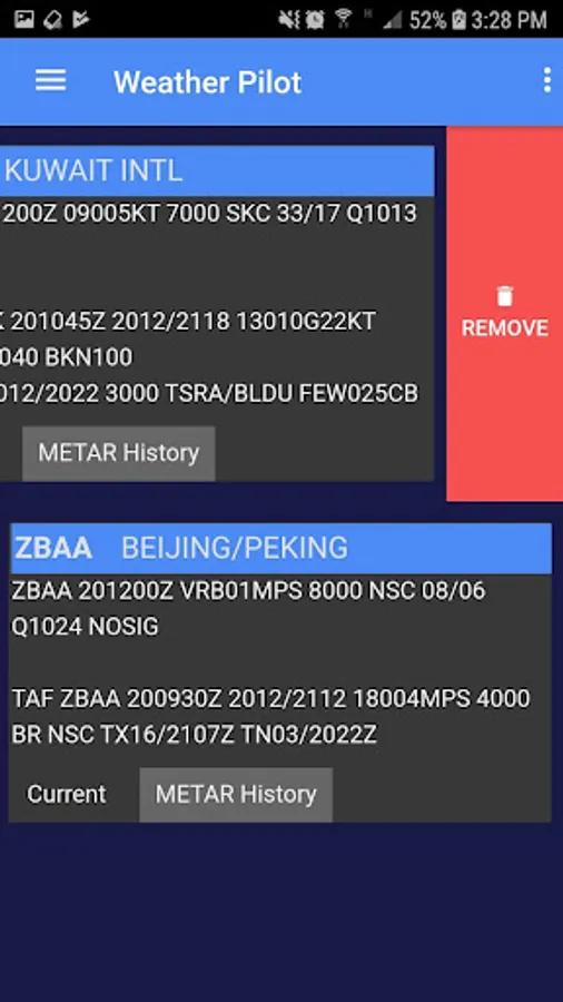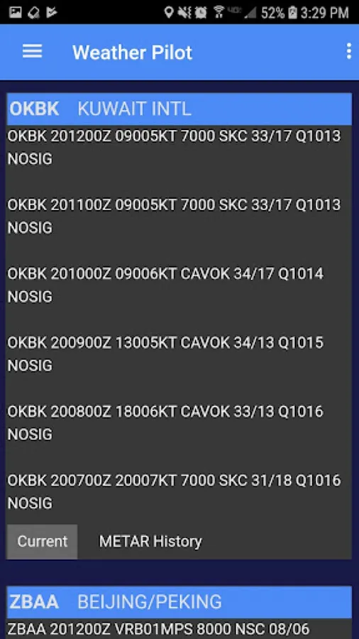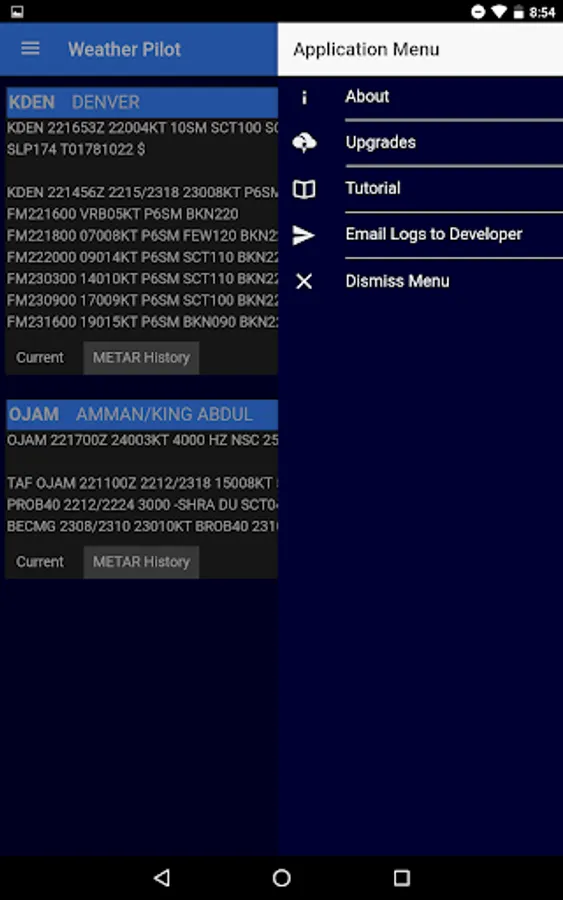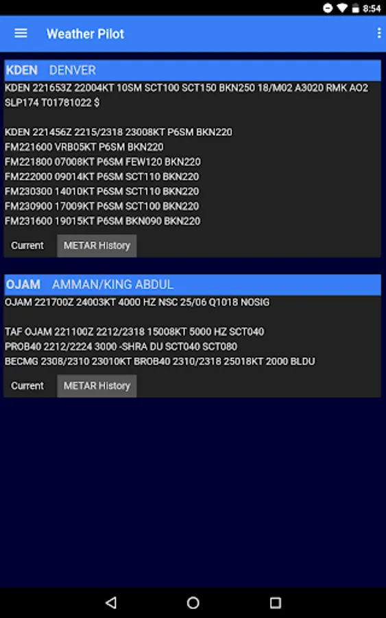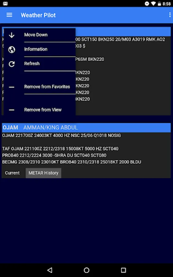 First and foremost this app is geared towards pilots and meteorologists. The application provides quick access to the latest METAR and TAF data for any ICAO most IATAs. Users can save favorites, search for stations by name, find stations near their current location, and view the station on a Map. Latest METAR and TAF data for stations being viewed by the user is also saved so that the weather information can be available if the application is launched when the device doesn't have a data connection.