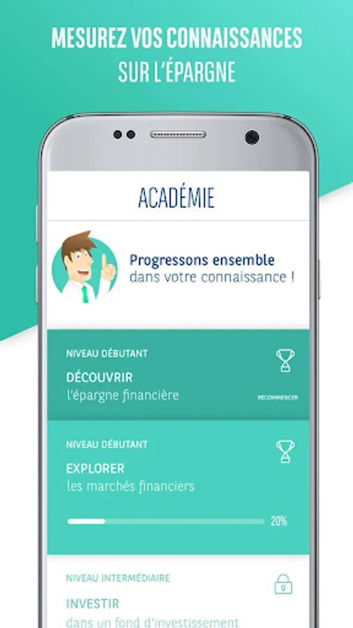 This is the first fun app to learn about financial savings. Whatever your level, we will not not help in acquiring your investment knowledge.