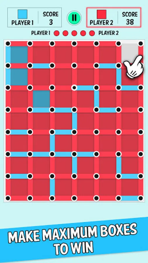 The goal of this game is to make the square. For every round, a player has to connect 2 dots (vertical or horizontal can be connected and make a line with only 2 connected dots) to draw a line between two adjacent dots. Players gain a point if he closes a square, Dots, and Boxes Classic Board Game. People also called this game a Paddock or square game. This is a 2 player game, players with more squares will be the winner.